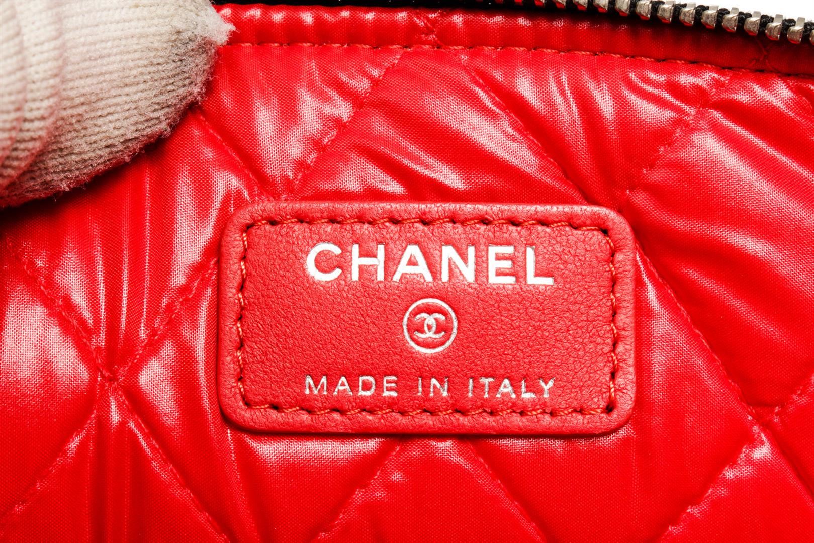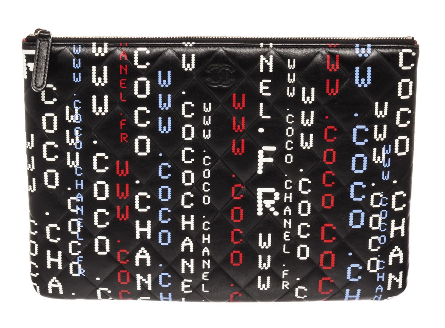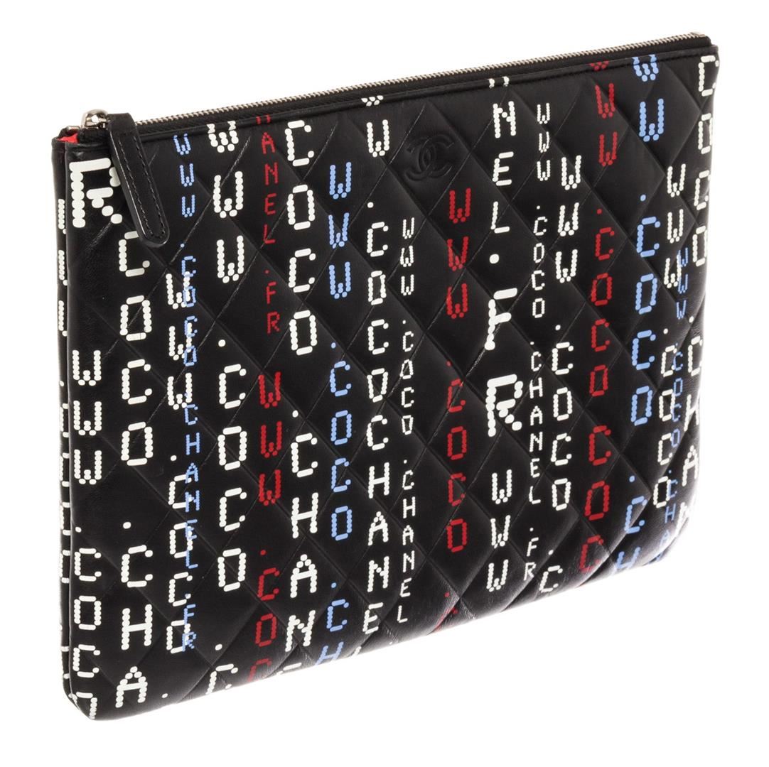 One Chanel Black Multicolor Quilted Lambskin Data Center O Case Clutch. Item is sold AS-IS. All available information is listed in the description and shown in the photo. Chanel Data Center O Case Clutch features black quilted Lambskin leather with multicolored letters that spell Chanel and Coco. The clutch has silver-tone zipper on top of the main compartment. The interior is lined in red quilted textile. Height 9.5", Width 13.5", Depth 1"