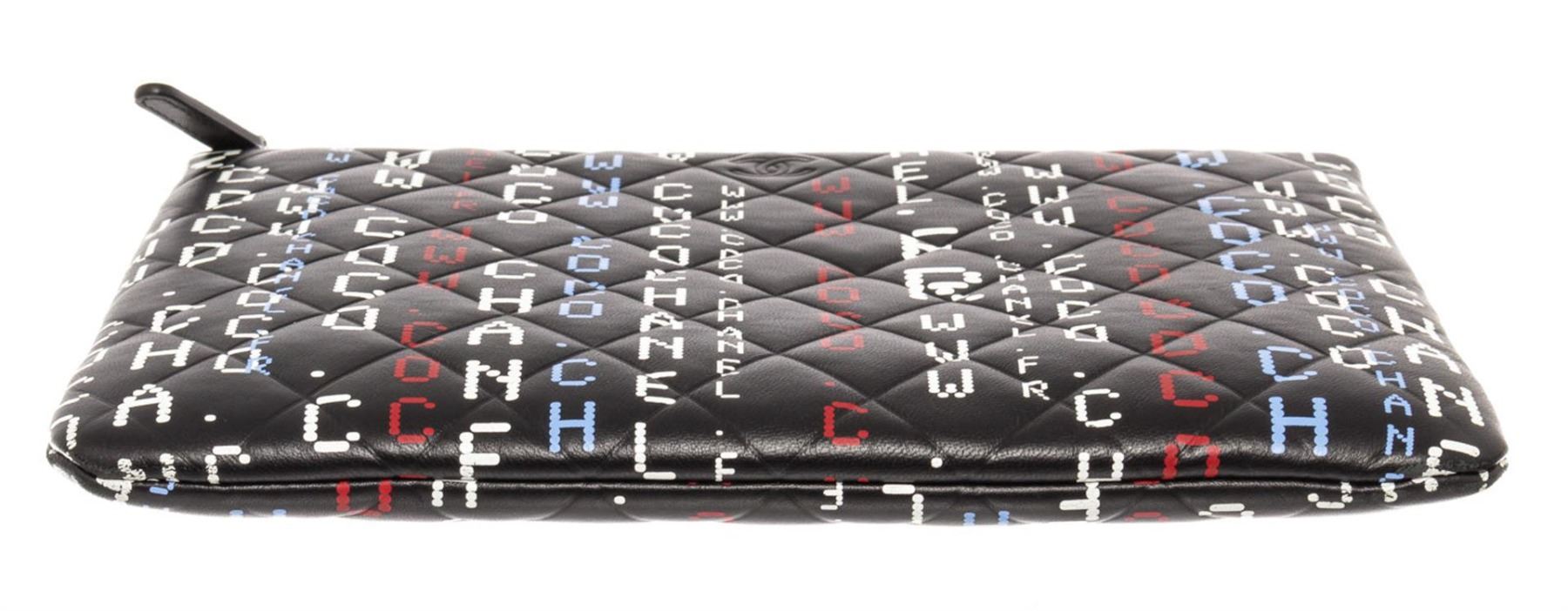 One Chanel Black Multicolor Quilted Lambskin Data Center O Case Clutch. Item is sold AS-IS. All available information is listed in the description and shown in the photo. Chanel Data Center O Case Clutch features black quilted Lambskin leather with multicolored letters that spell Chanel and Coco. The clutch has silver-tone zipper on top of the main compartment. The interior is lined in red quilted textile. Height 9.5", Width 13.5", Depth 1"