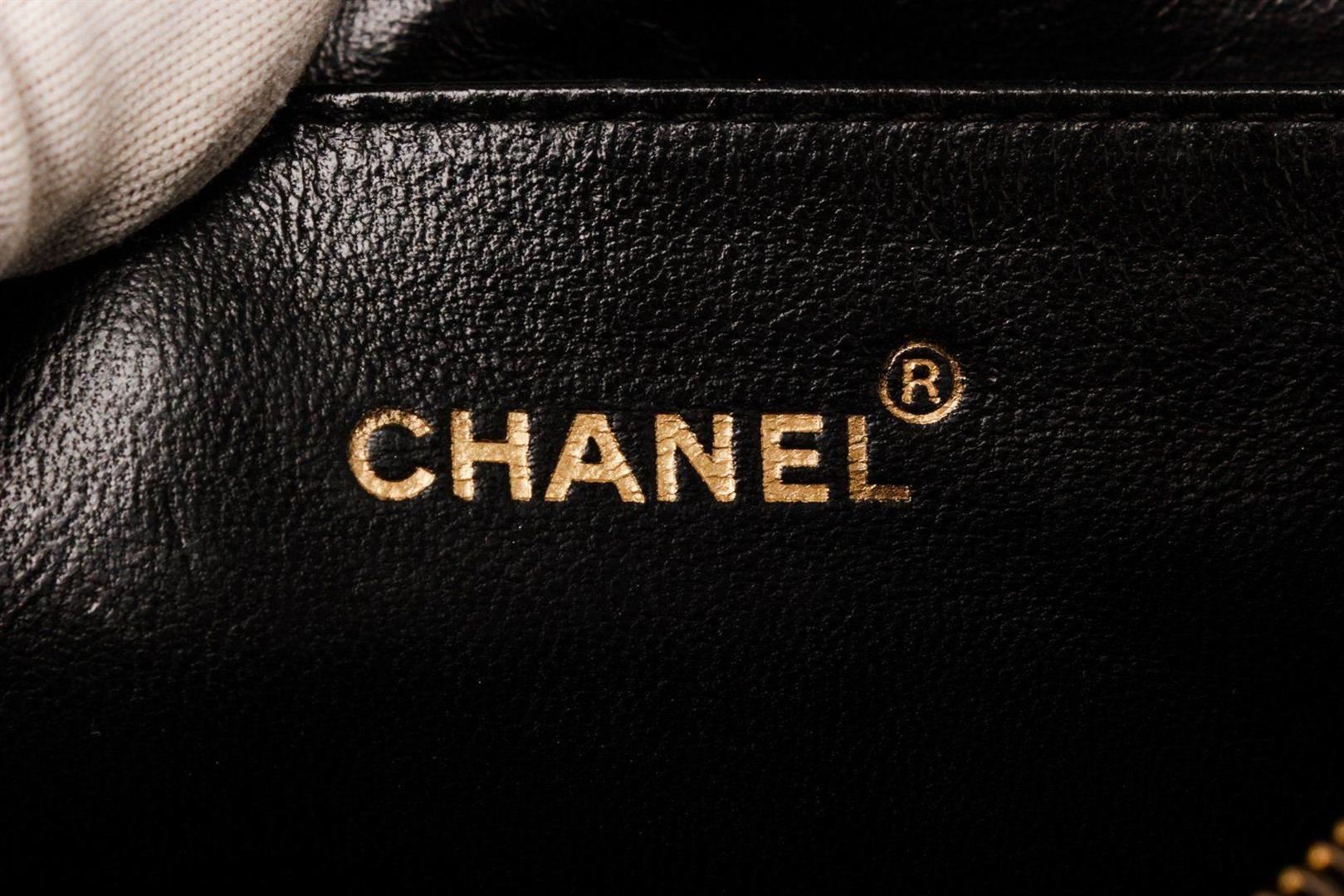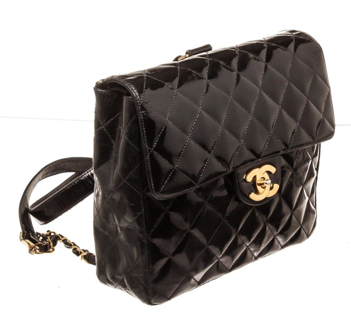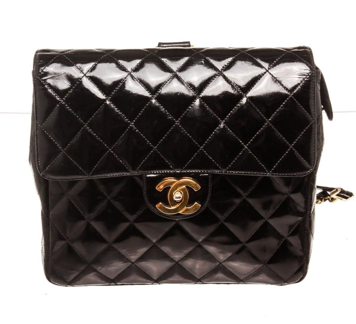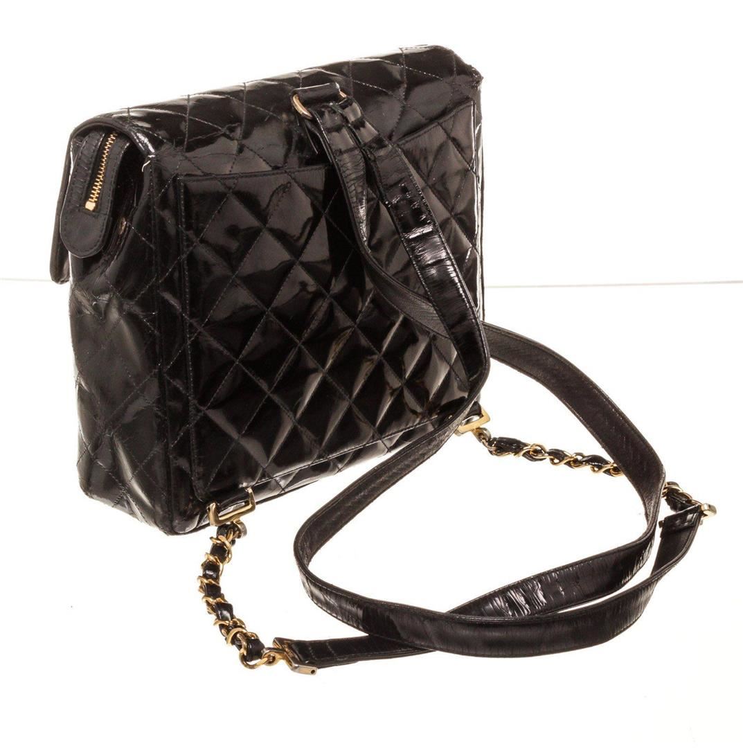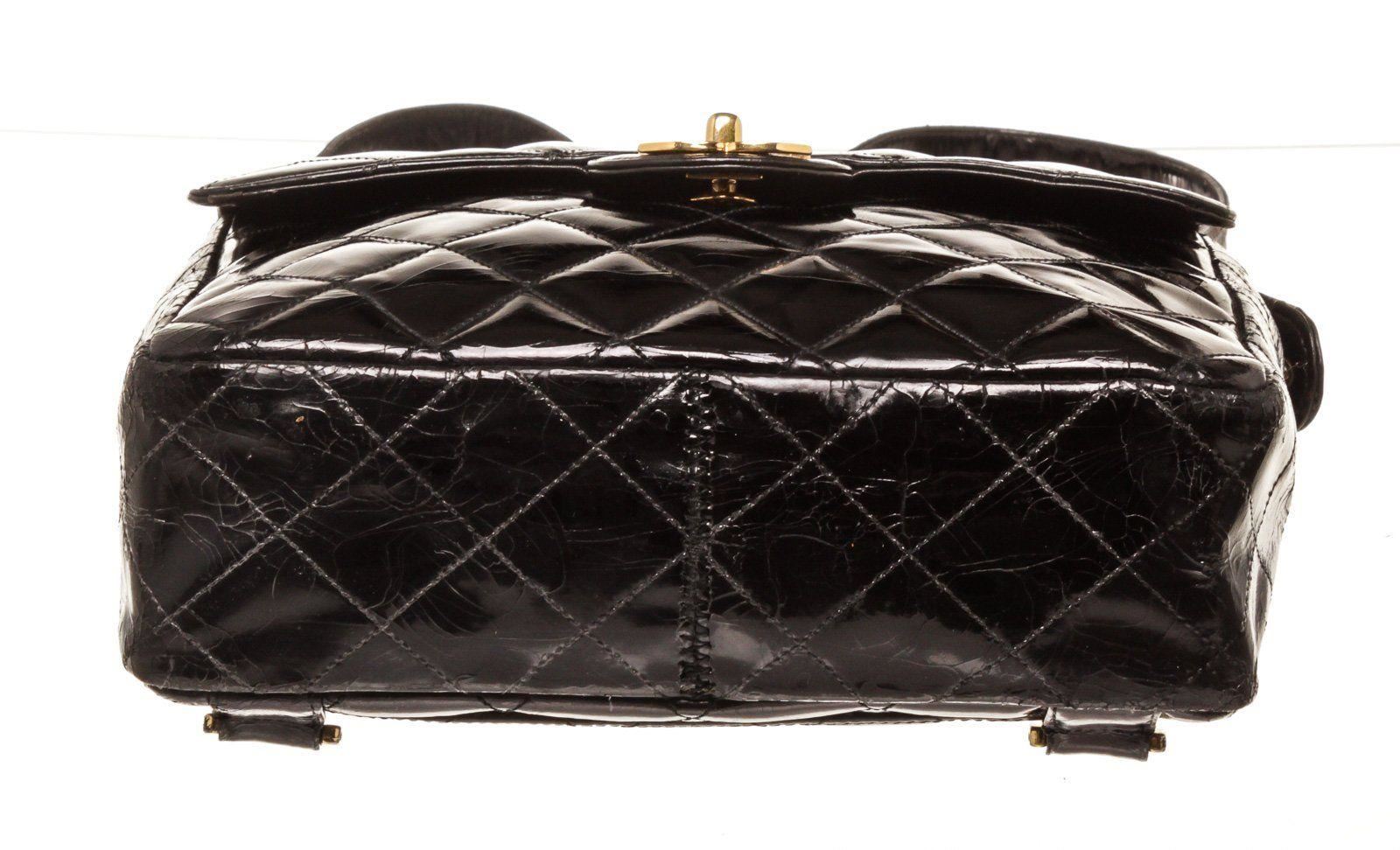 Chanel Black Patenet Leather Flap Backpack with material leather, gold-tone hardware, trim leather, interior zip pocket, shoulder strap and flap closure.