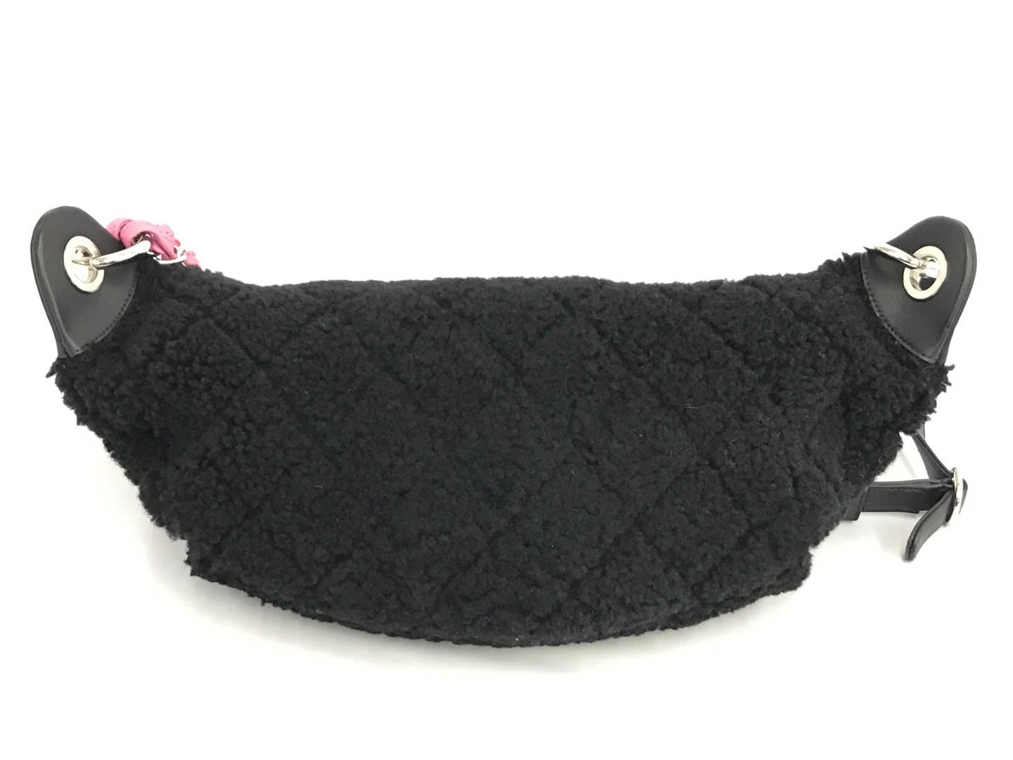 Chanel Coco waist bag is crafted in black woolly sheep leather and pink tweed, silver-tone hardware, black and pink chain and leather waist strap, interlocking CC logo charm at the front pocket zip puller, zipper closure at top that will open to black qui