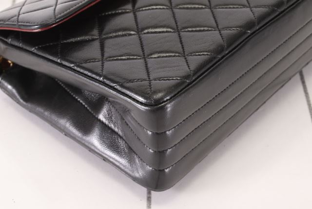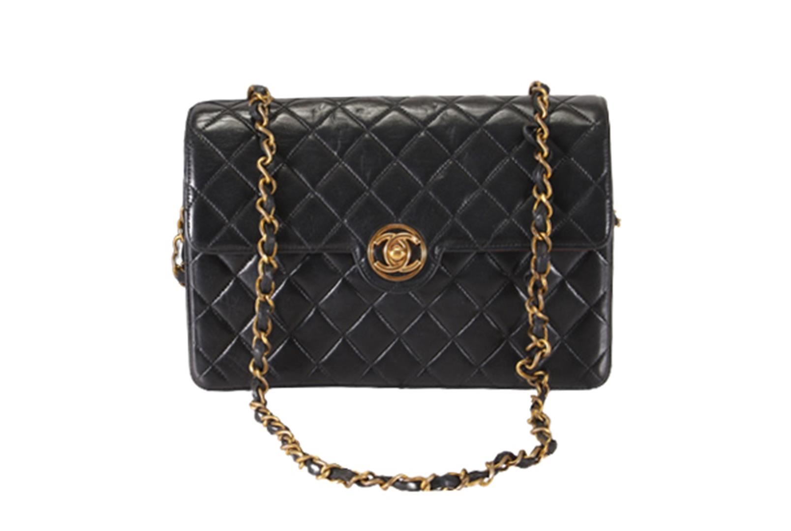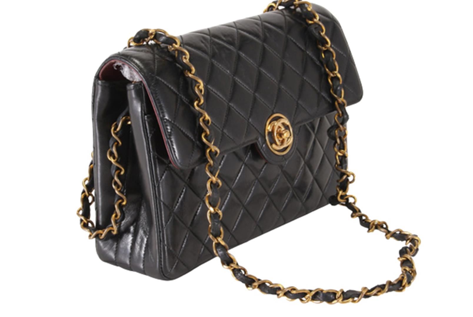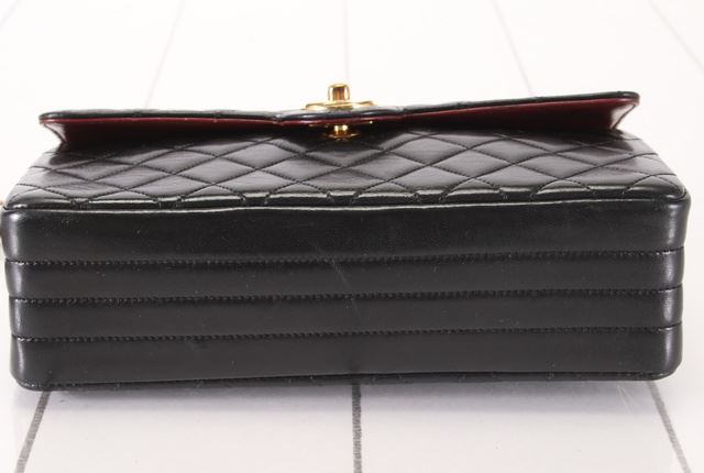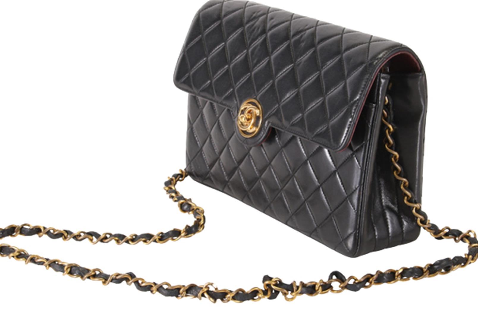 One Chanel Black Quilted Lambskin Leather CC Turn-lock Small Flap Shoulder Bag. Item is sold AS-IS. All available information is listed in the description and shown in the photo. Black quilted Lambskin leather Chanel CC Circle Turn-lock Flap small shoulder bag with gold-tone hardware, front flap with circle CC turn-lock closure at front, woven leather and chain-link shoulder strap, red leather lining and three pockets inside; 2 slip and 1 zip. Length: 8.4" (21 cm) Height: 5.25" (13 cm) Depth: 2.5" (6 cm) Strap Drop: 19.5" (49 cm)