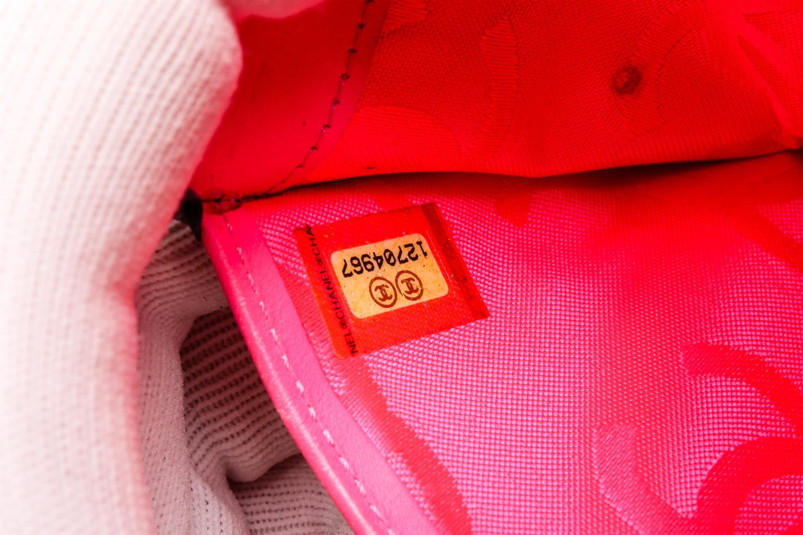 Black quilted leather Chanel Ligne Cambon compact wallet with silver-tone hardware, interlocking CC appliqué at exterior, tonal patent leather trim, single exterior compartment featuring push-lock closure, neon pink jacquard CC lining, single bill compartment, six card slots, dual interior slit pockets and snap closure at back.