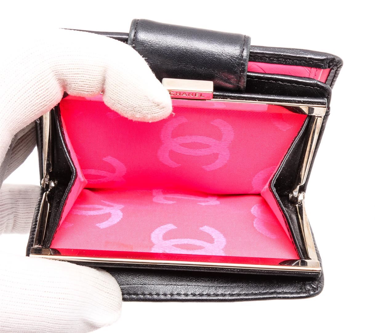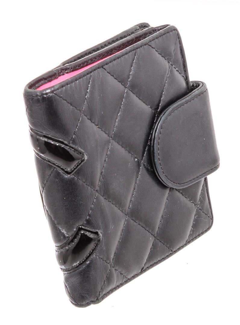Black quilted leather Chanel Ligne Cambon compact wallet with silver-tone hardware, interlocking CC appliqué at exterior, tonal patent leather trim, single exterior compartment featuring push-lock closure, neon pink jacquard CC lining, single bill compartment, six card slots, dual interior slit pockets and snap closure at back.