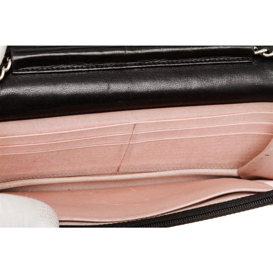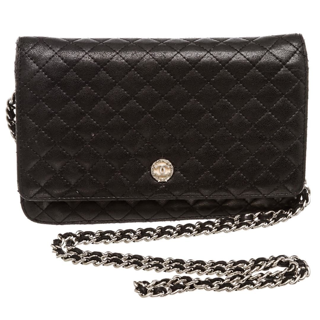 Black quilted leather leather Chanel Wallet On Chain with silver-tone hardware, single leather and chain-link shoulder strap, logo adornment at front, single zip pocket flap underside, single slit pocket under front flap, dual compartments; one with zip closure, six card slots and snap closure at front flap. Authentic.