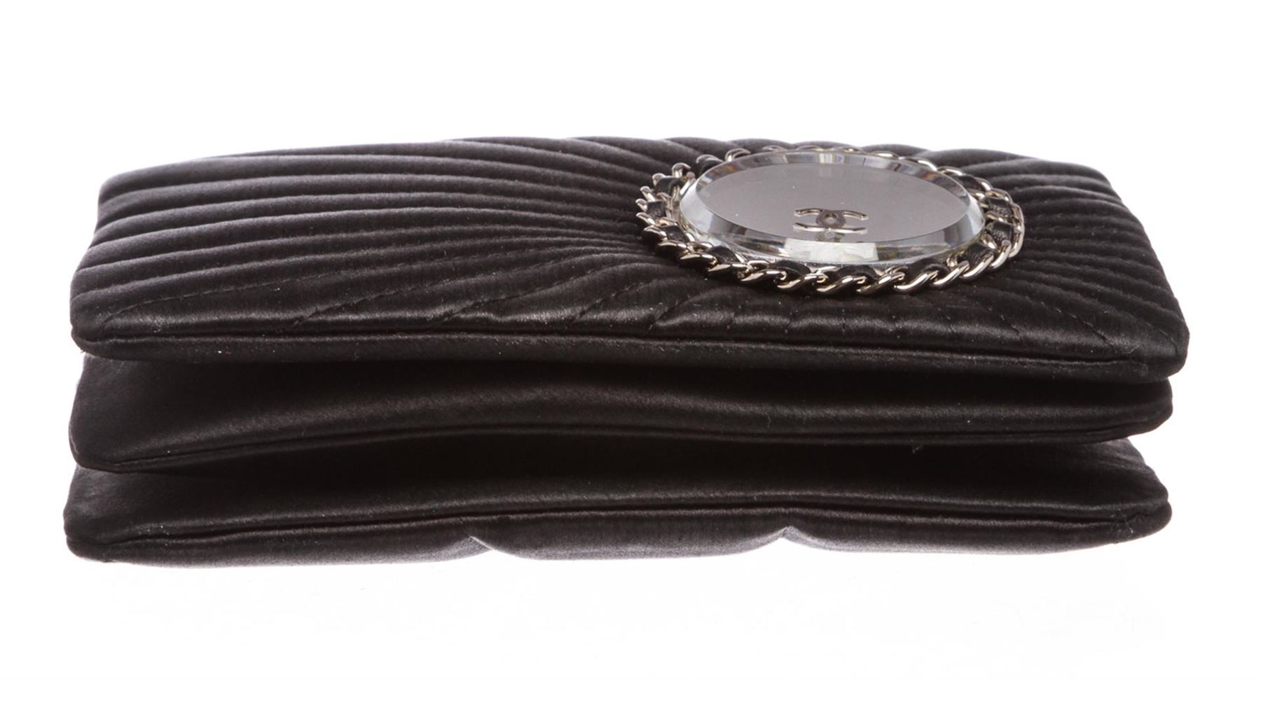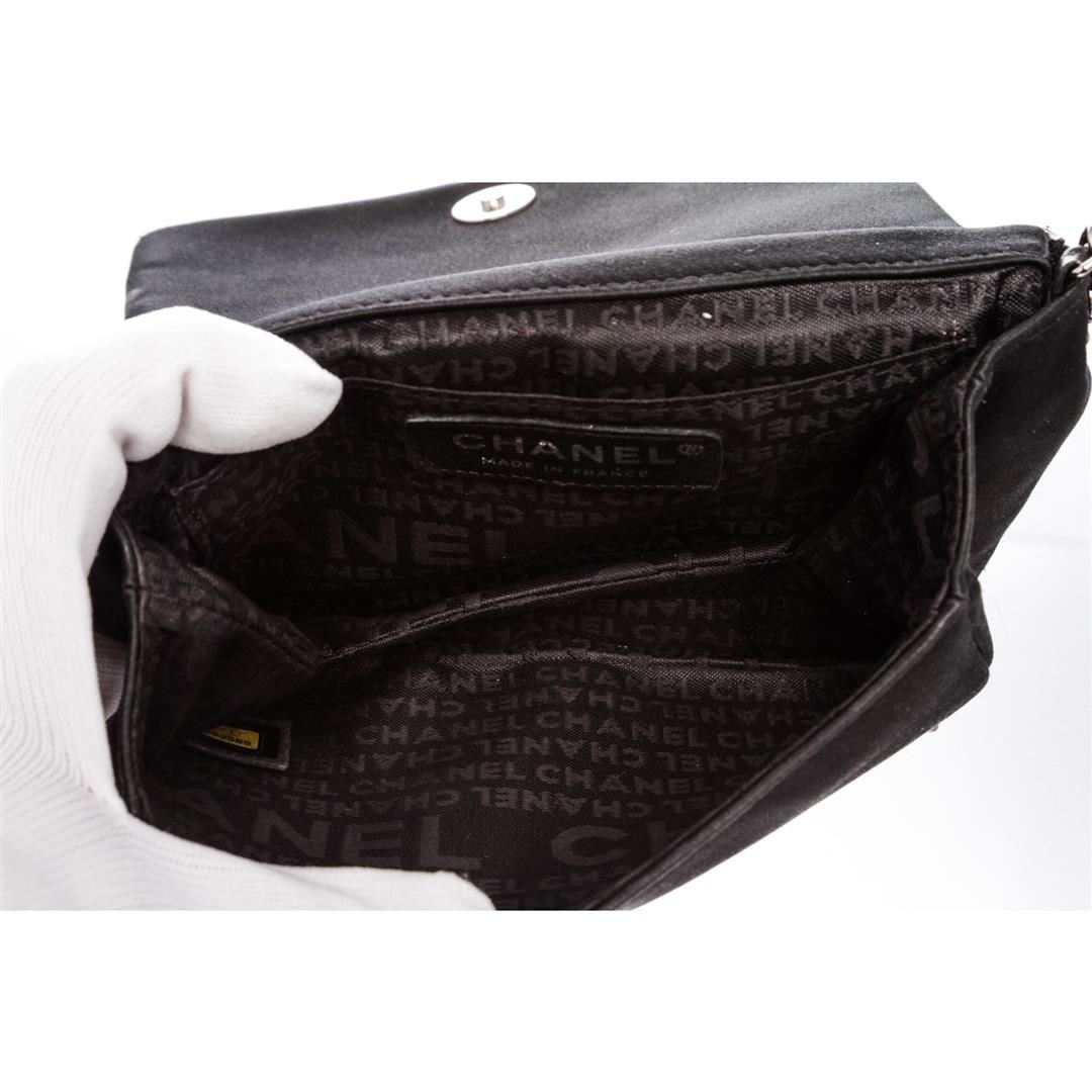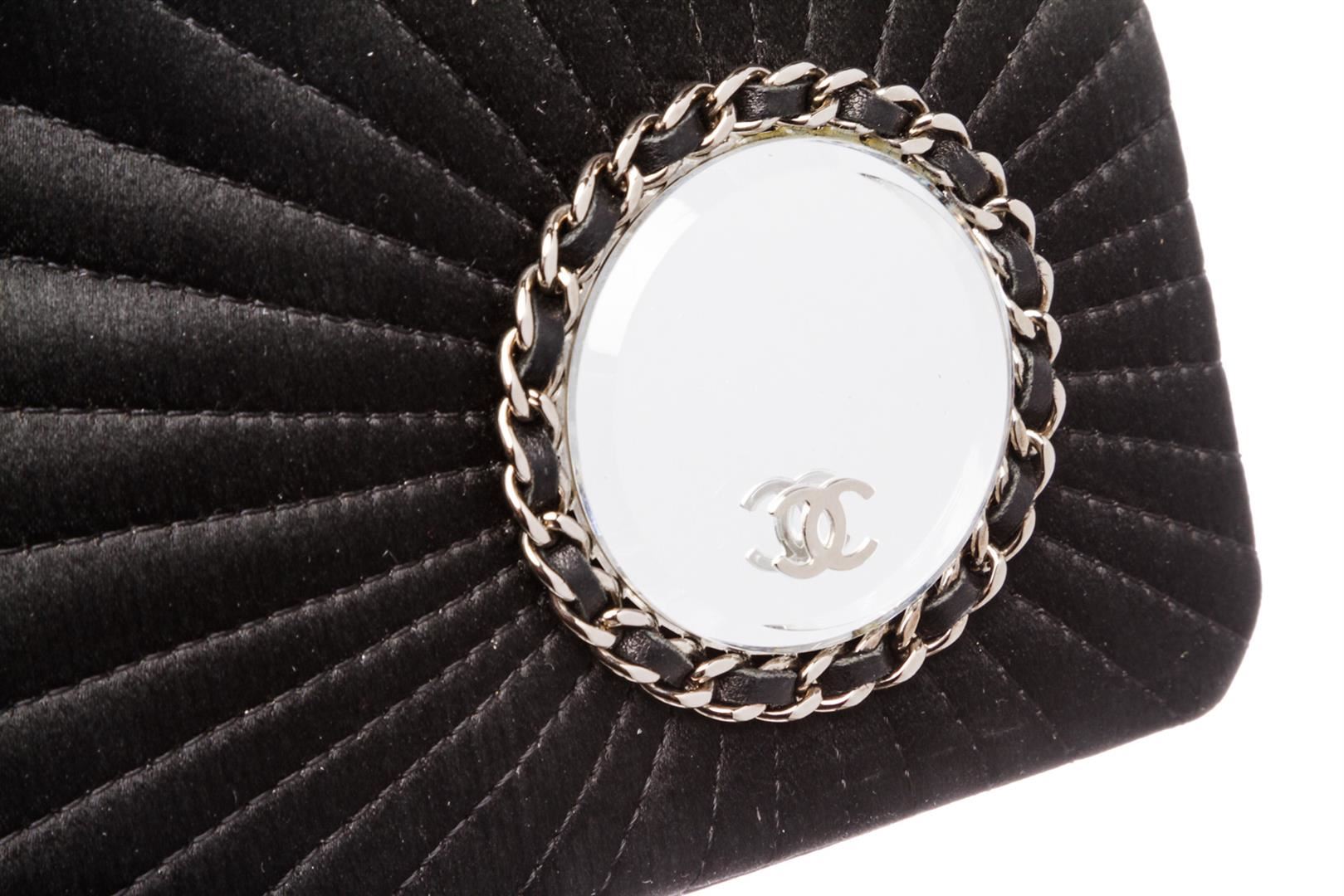 Black satin Chanel Vanity convertible clutch with silver-tone hardware, tonal leather trim, optional chain-link and leather top handle, mirrored adornment with chain-link and CC logo accents at front, tonal satin lining, single pocket at interior wall and magnetic snap closure at front flap.