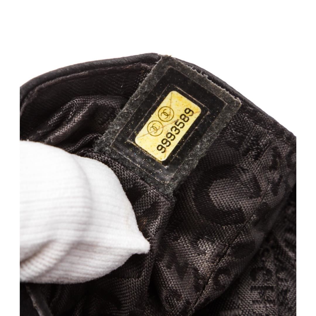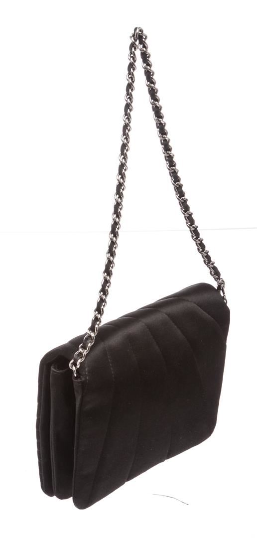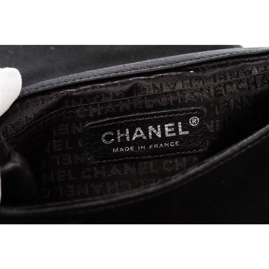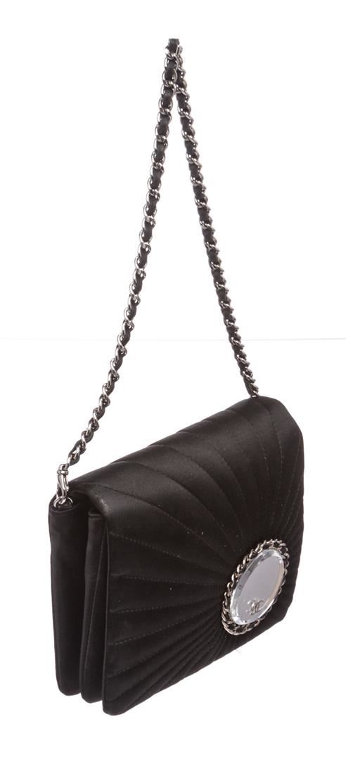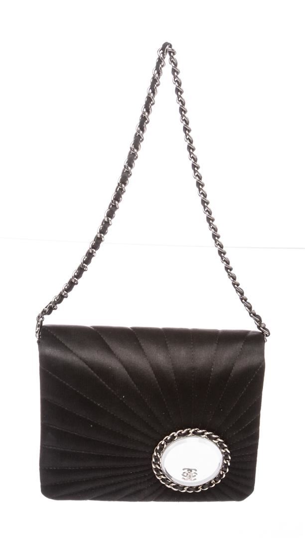 Black satin Chanel Vanity convertible clutch with silver-tone hardware, tonal leather trim, optional chain-link and leather top handle, mirrored adornment with chain-link and CC logo accents at front, tonal satin lining, single pocket at interior wall and magnetic snap closure at front flap.