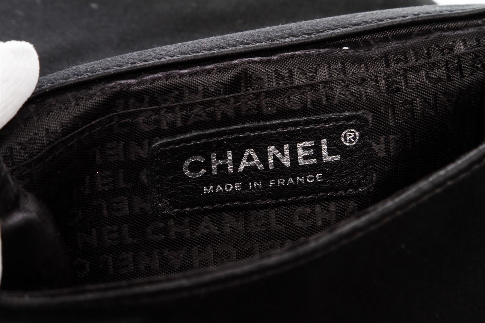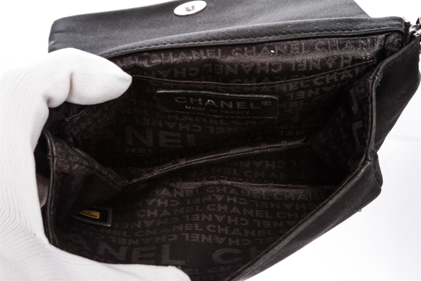 Black satin Chanel Vanity convertible clutch with silver-tone hardware, tonal leather trim, optional chain-link and leather top handle, mirrored adornment with chain-link and CC logo accents at front, tonal satin lining, single pocket at interior wall and magnetic snap closure at front flap.