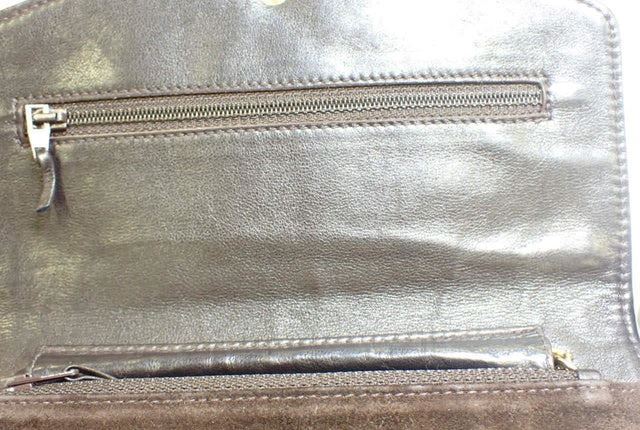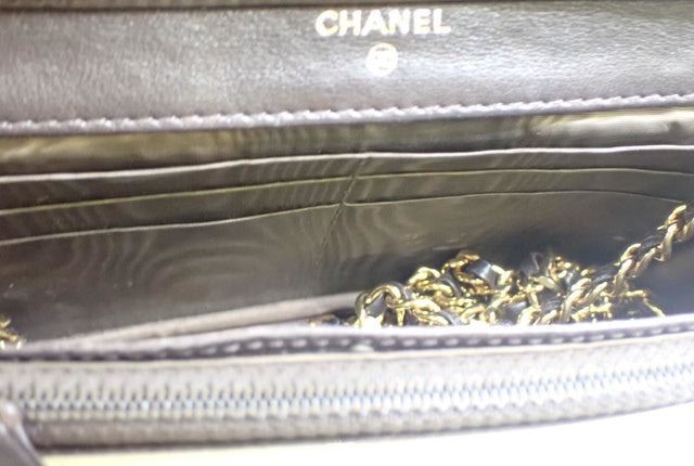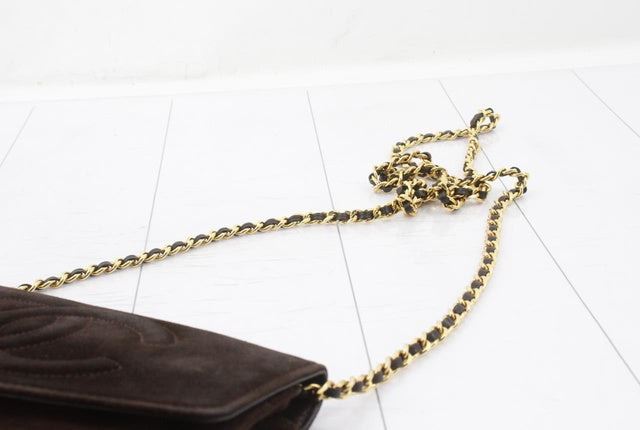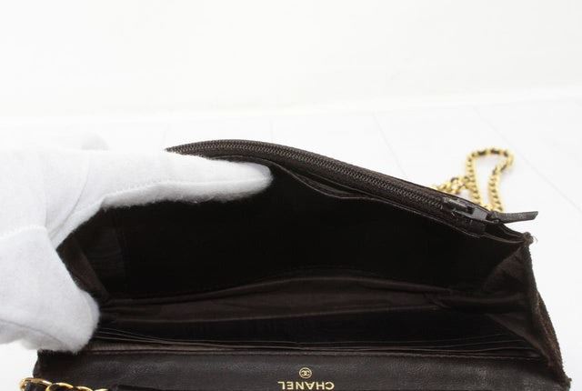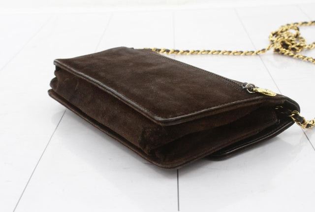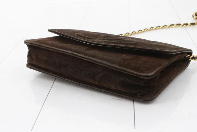 Chanel Wallet on Chain features black suede leather with interlocking CC logo at front, gold-tone hardware, exterior zipped pocket at back, three interior compartments pocket with six card slots, intertwined leather and chain shoulder strap, black leather