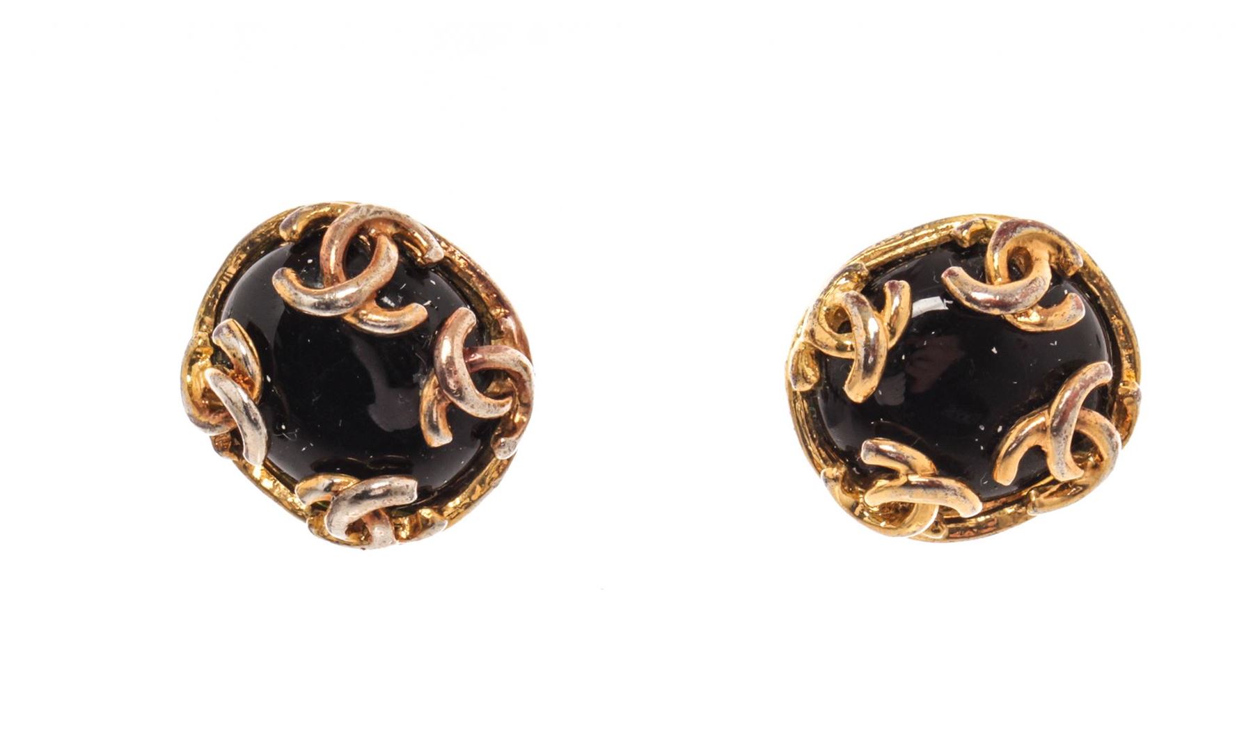 Chanel Black and Gold Pearl CC Logo Round Earrings. All available information is listed in the description and shown in the photos. Chanel Black and Gold Pearl CC Logo Round Earrings with black pearl, cc logo round, gold tone hardware, clip-on closure on back.