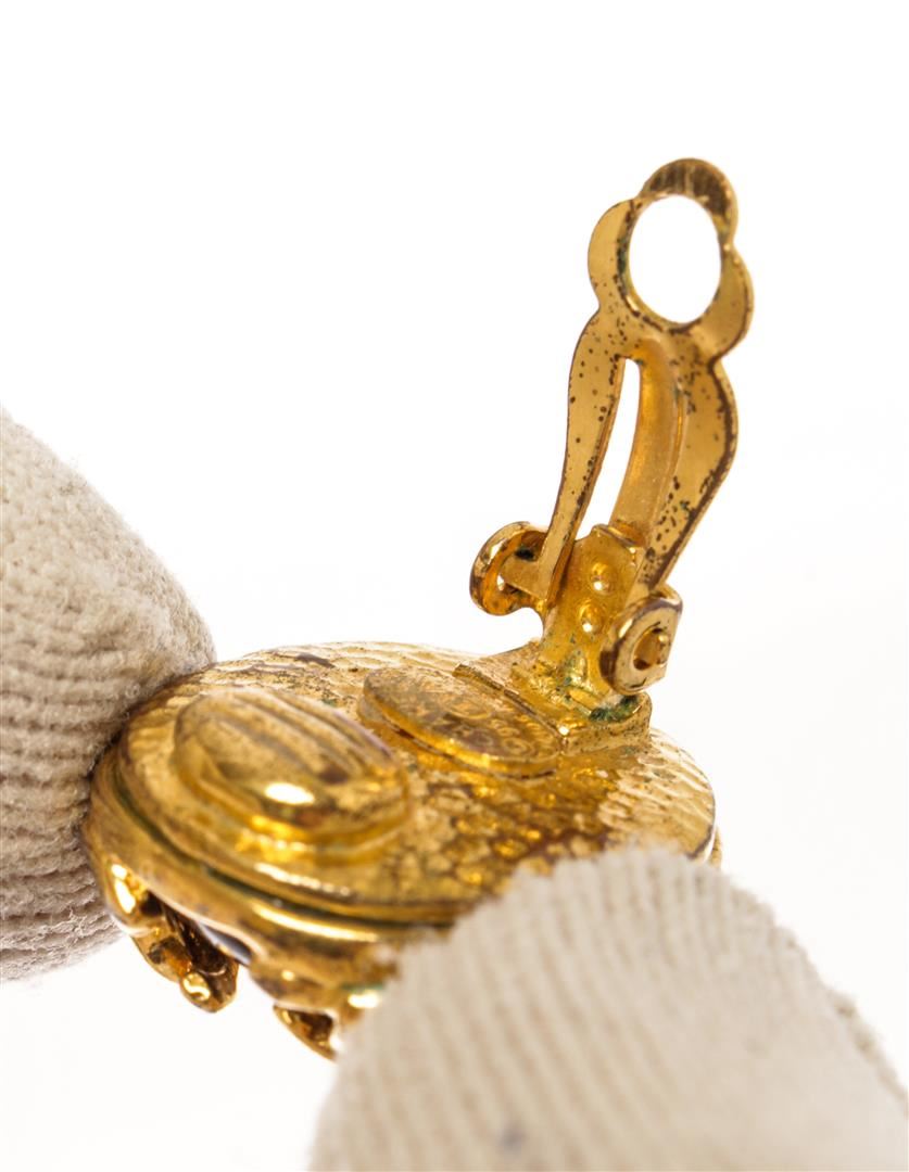 Chanel Black and Gold Pearl CC Logo Round Earrings. All available information is listed in the description and shown in the photos. Chanel Black and Gold Pearl CC Logo Round Earrings with black pearl, cc logo round, gold tone hardware, clip-on closure on back.