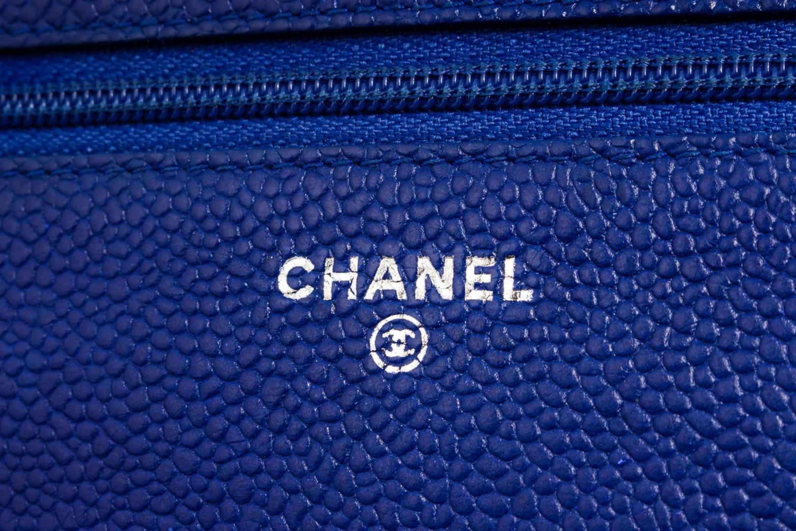 Chanel Blue Caviar Leather CC Button Wallet on Chain. All available information is listed in the description and shown in the photos. Blue grained Caviar leather Chanel CC Button wallet on chain with silver-tone hardware, a button with interlocking CC logo at the center, front flap with snap closure that will open to aqua green leather-lined interior with one zipped pocket, one slip pocket and multiple card slots. 7.5"x5"x1" Strep Drop : 25"