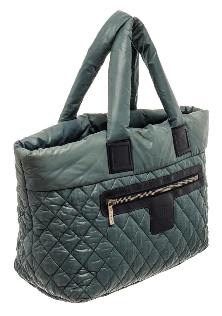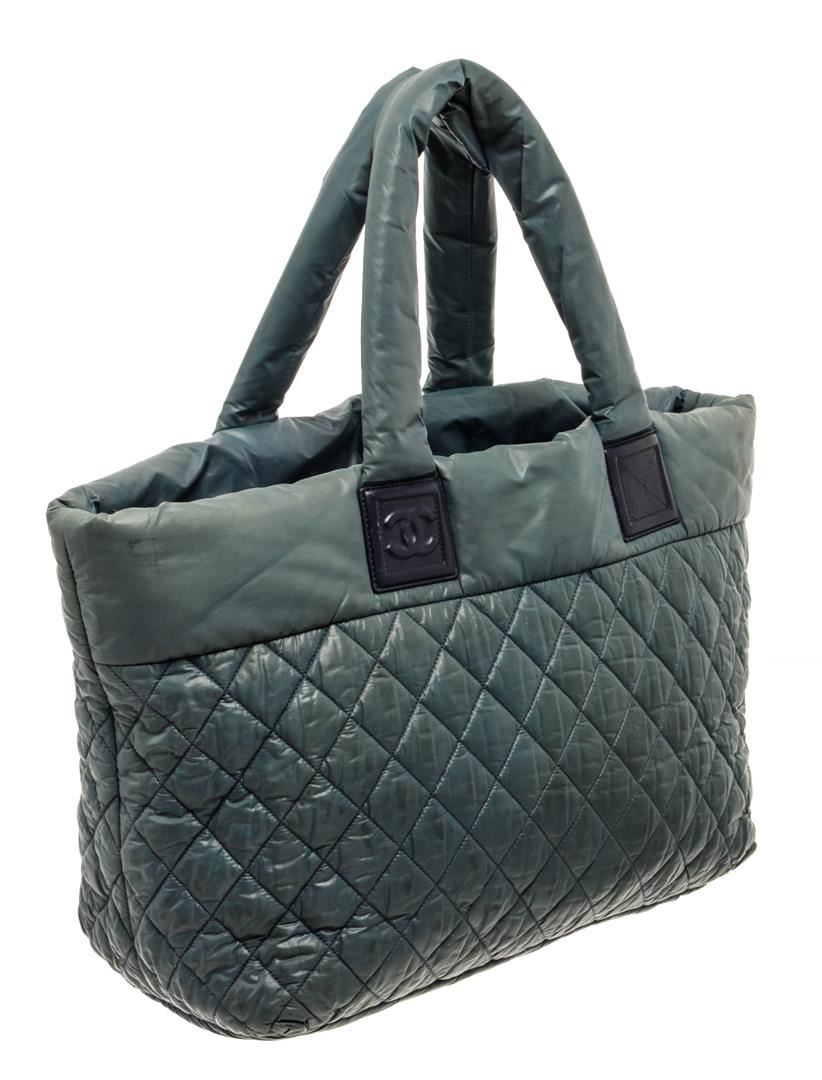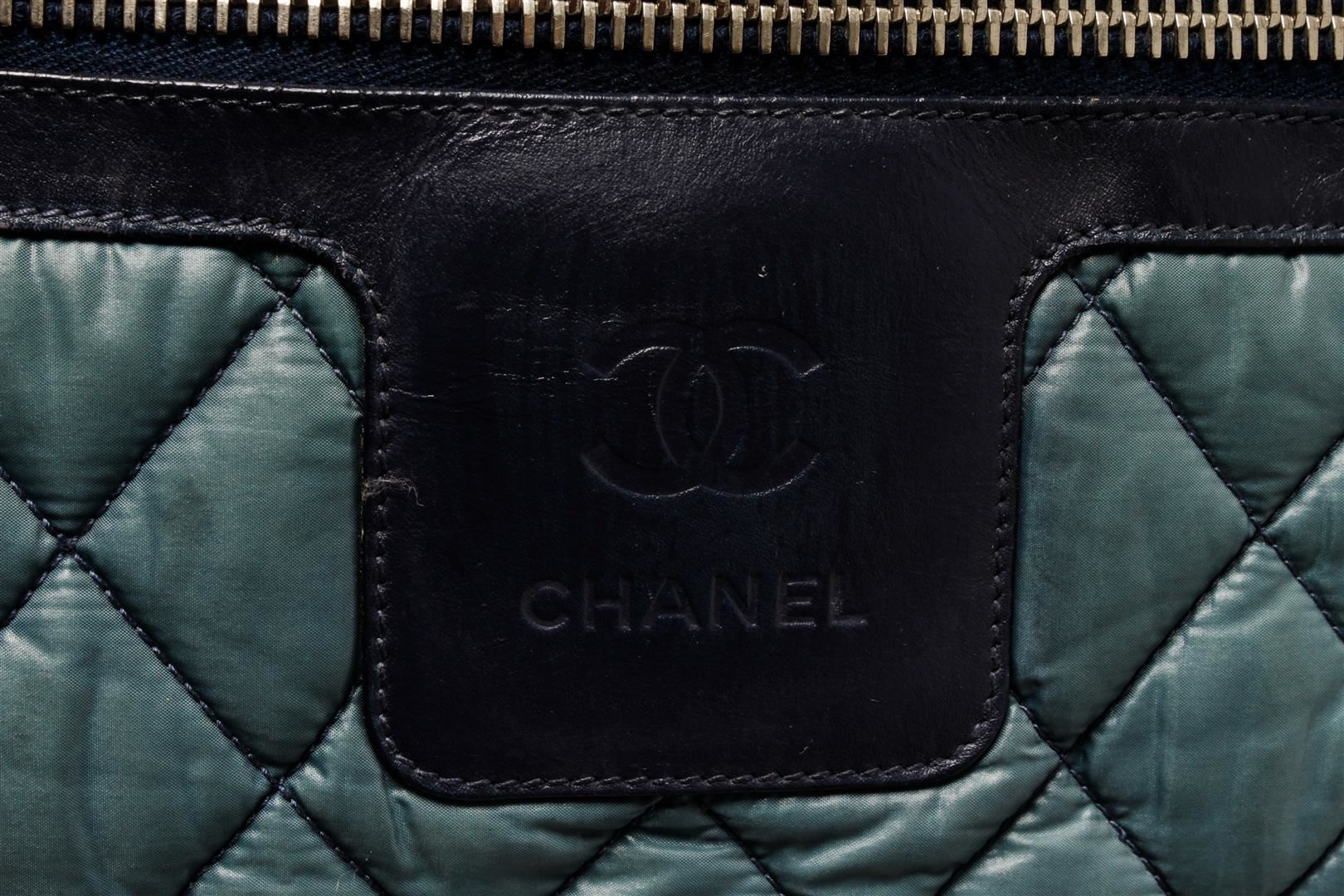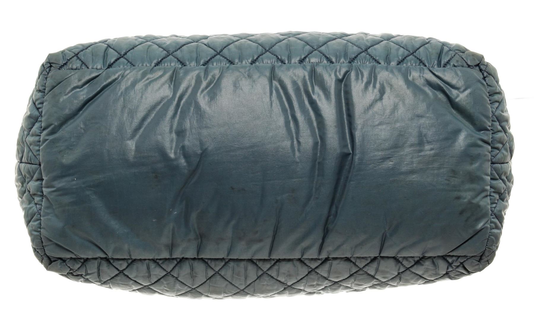 One Chanel Blue Quilted Nylon Cocoon Front Zipped Tote Bag. Item is sold AS-IS. All available information is listed in the description and shown in the photo. Chanel Blue Quilted Nylon Cocoon Front Zipped Tote Bag with silver-tone hardware, front zip pocket, black leather lining, dual leather top handles, and zip closure at the top. .