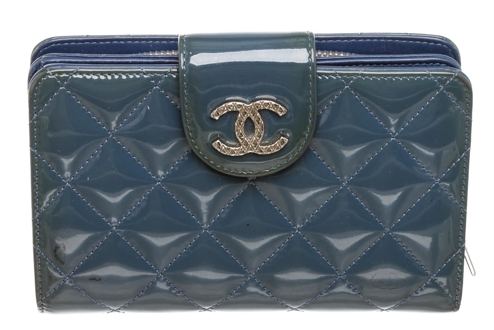 One Chanel Blue Quilted Patent Leather Compact Wallet. Blue Chanel quilted patent leather, silver-tone hardware, and CC snap closure at front. MKX
