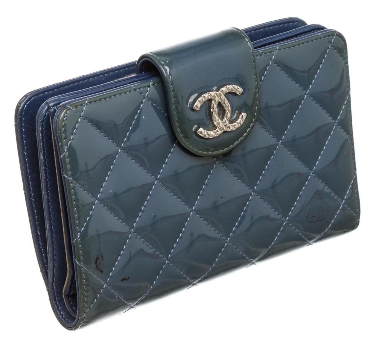 One Chanel Blue Quilted Patent Leather Compact Wallet. Blue Chanel quilted patent leather, silver-tone hardware, and CC snap closure at front. MKX