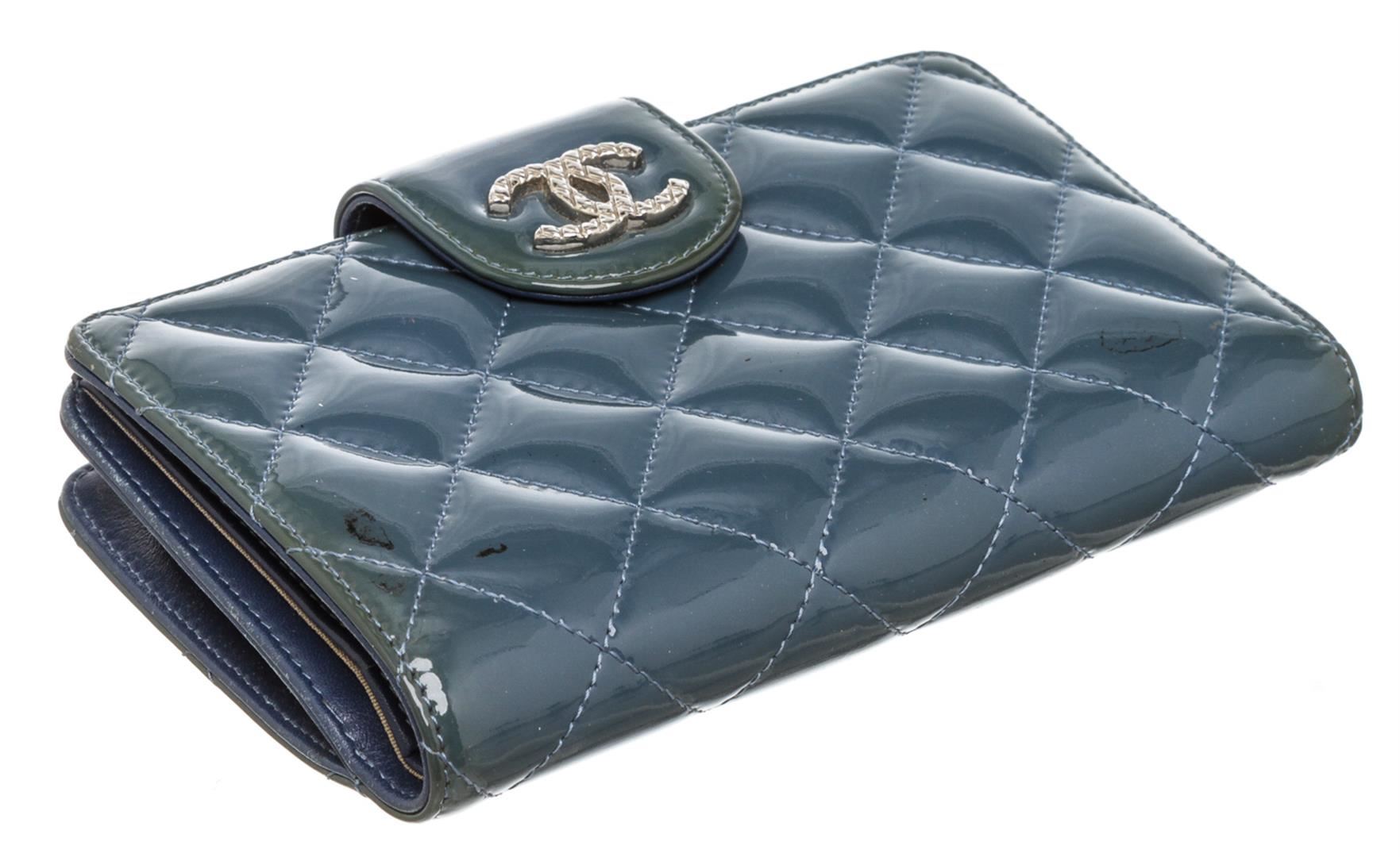 One Chanel Blue Quilted Patent Leather Compact Wallet. Blue Chanel quilted patent leather, silver-tone hardware, and CC snap closure at front. MKX