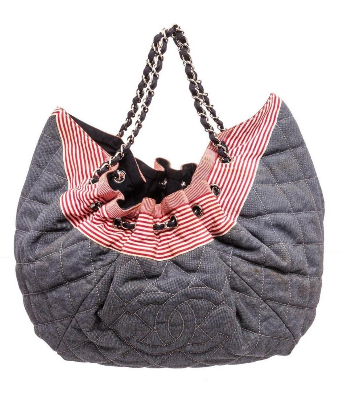 Chanel Blue Red Denim Quiled Stretch Spring Tote Bag with silver-tone hardware, interior flap pockets, fabric chain strap, and closure. Measurements: Length: 13.5 in / 34 cm Width: 5 in / 13 cm 13 in / 33 cmCONDITION: Pre-Owned Good overall, please see photographs for detail.