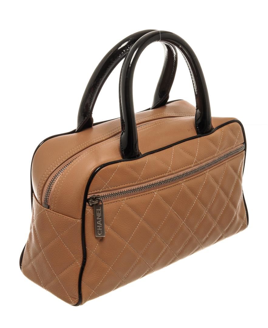 One Chanel Brown Black Quilted Caviar Mini Boston Bowler Bag. Item is sold AS-IS. All available information is listed in the description and shown in the photo. Chanel Brown Black Quilted Caviar Mini Boston Bowler Bag with brass hardware, foot base, exterior zip pocket, Chanel scripted logo at the front, brown leather lining, dual rolled leather handles, zip closure at the top. .