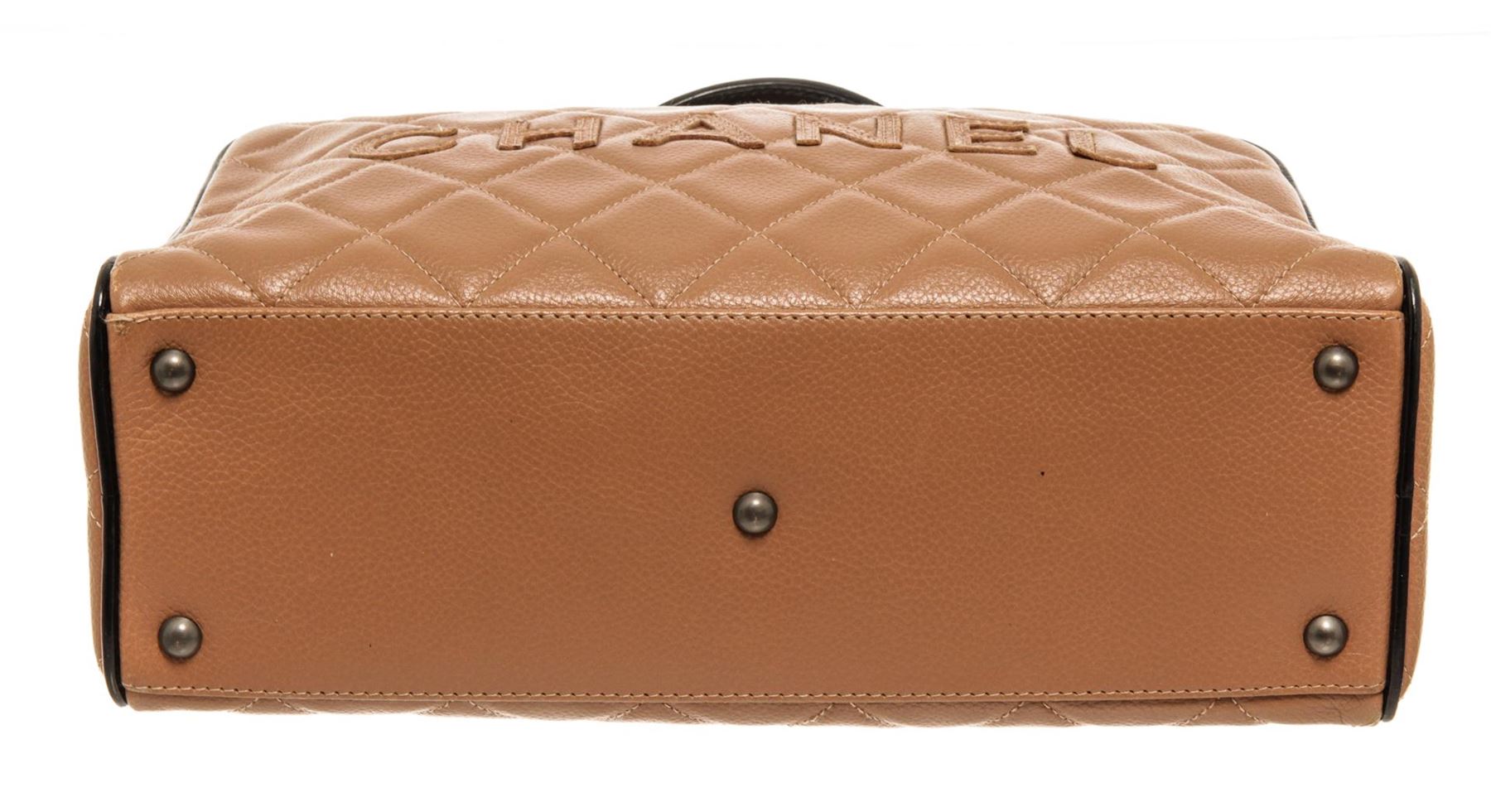 One Chanel Brown Black Quilted Caviar Mini Boston Bowler Bag. Item is sold AS-IS. All available information is listed in the description and shown in the photo. Chanel Brown Black Quilted Caviar Mini Boston Bowler Bag with brass hardware, foot base, exterior zip pocket, Chanel scripted logo at the front, brown leather lining, dual rolled leather handles, zip closure at the top. .