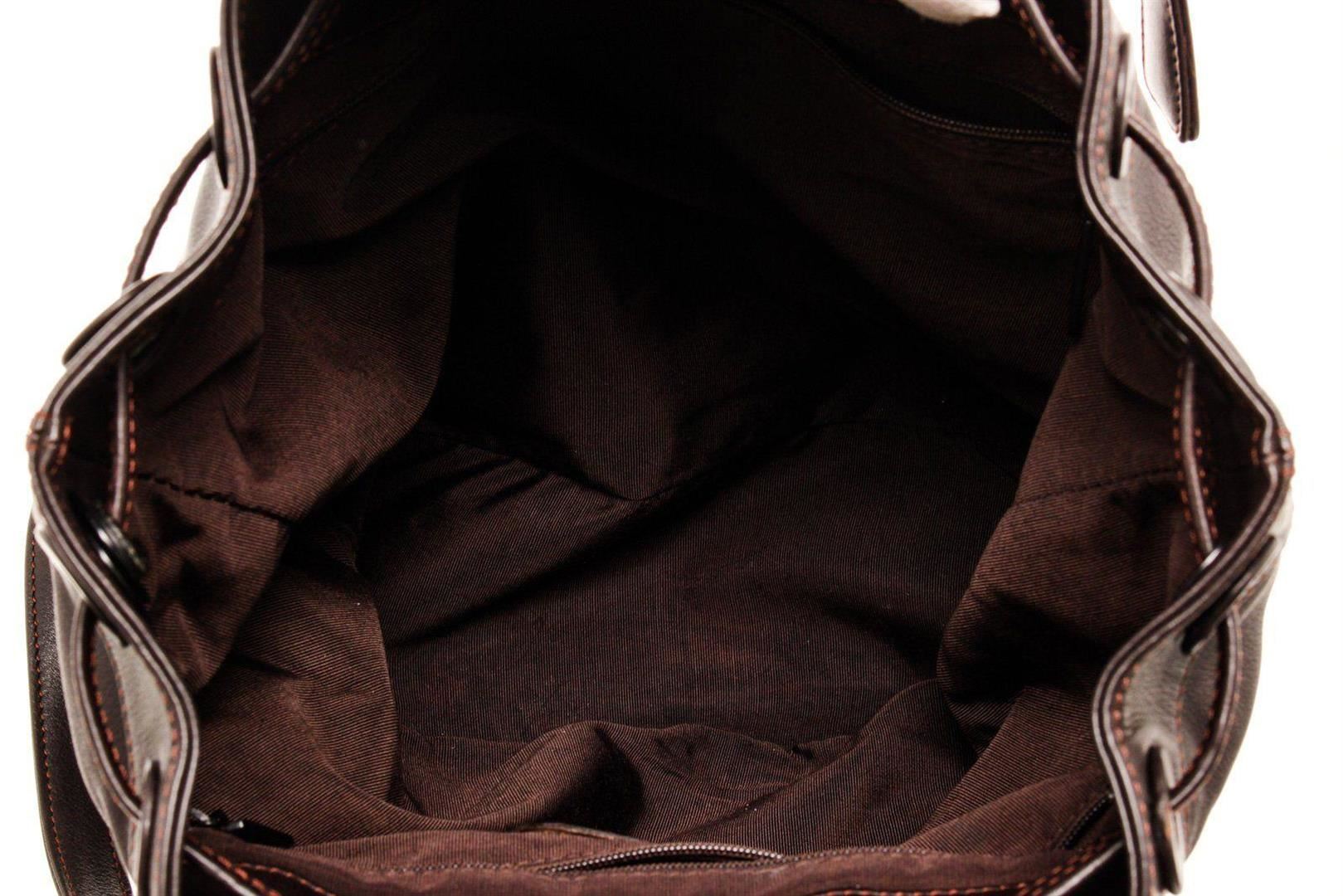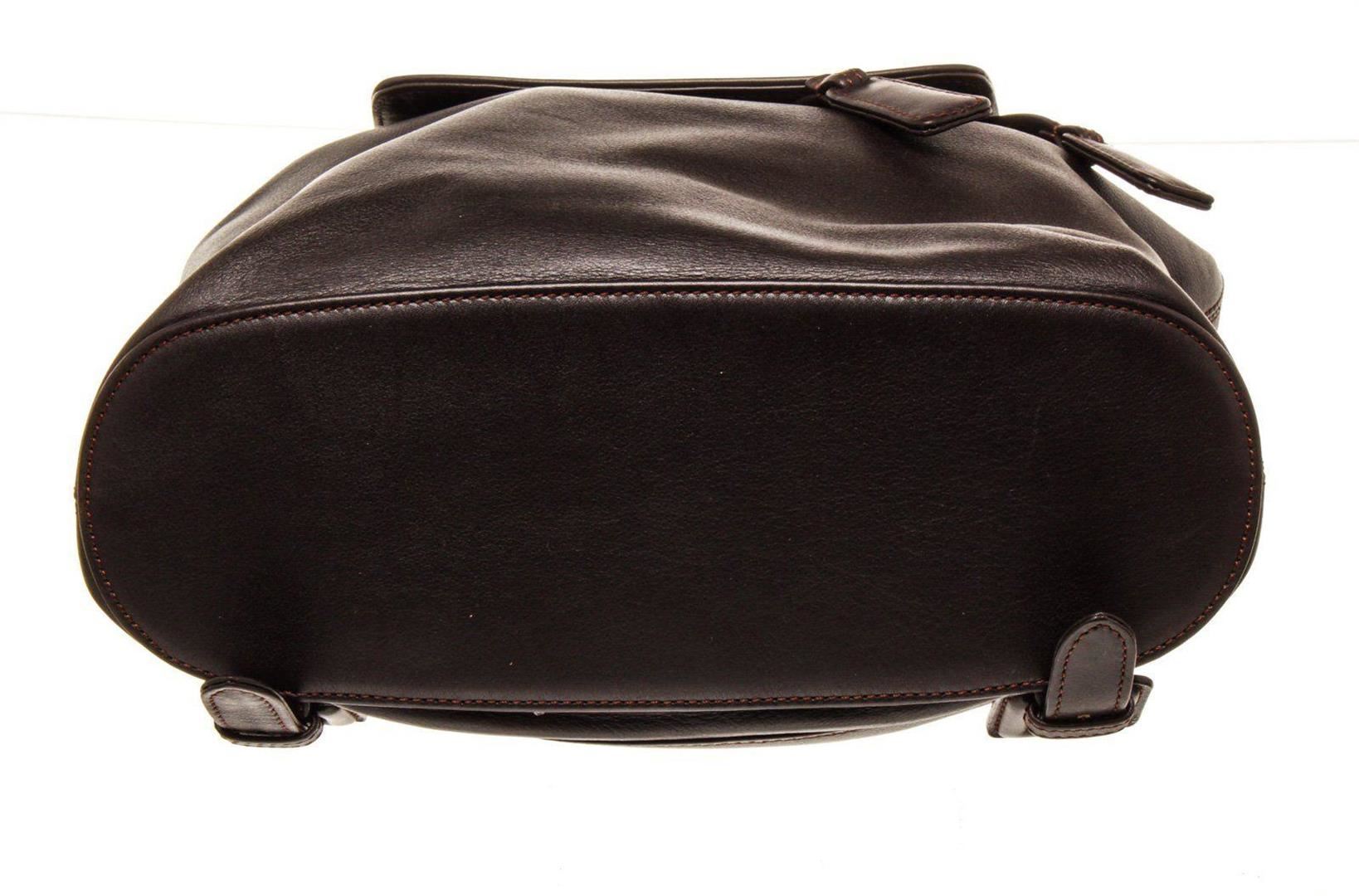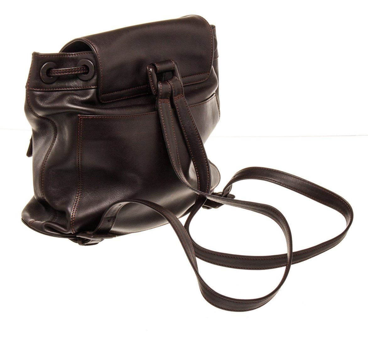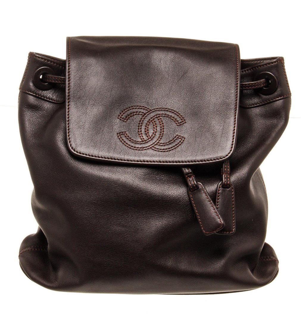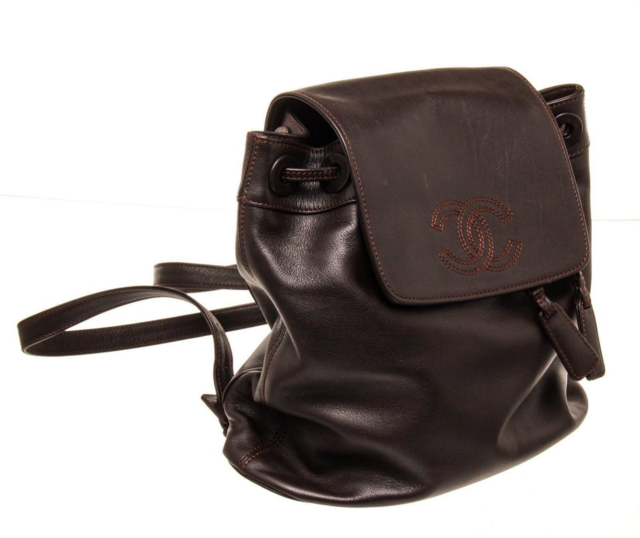 Chanel Brown Calfskin CC Drawstring Flap Backpack Bag with leather, gold-tone hardware, interior zip pockets, shoulder strap and snap closure.