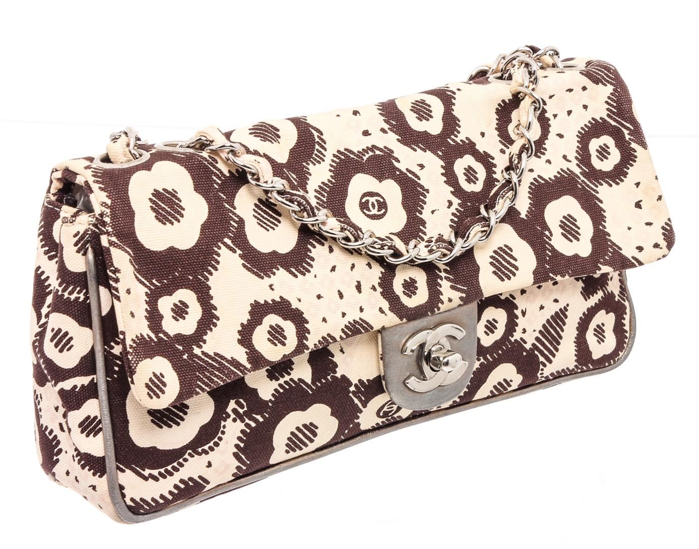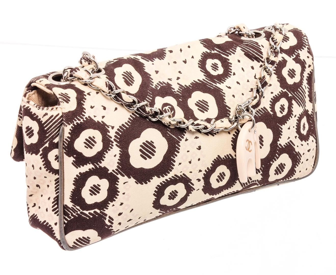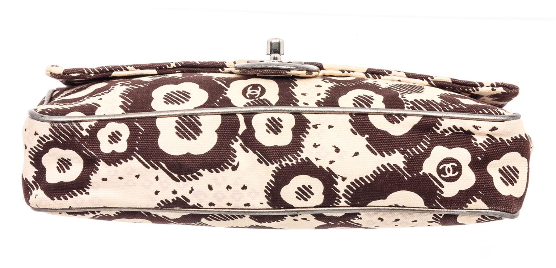 Crafted out of cream and brown Camelia fabric pattern, silver-tone hardware, and turn lock CC at front flap. Inner cream fabric lining.