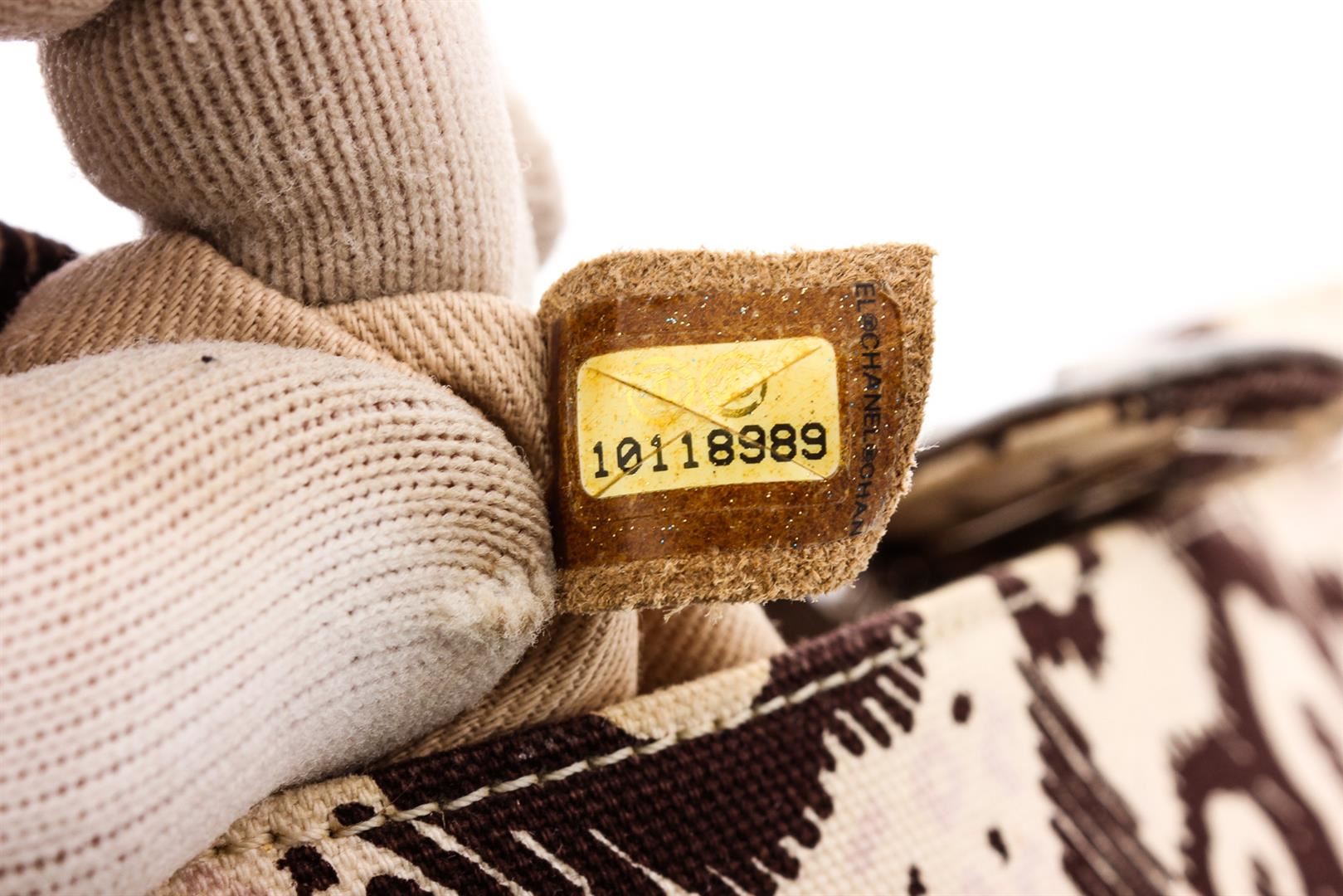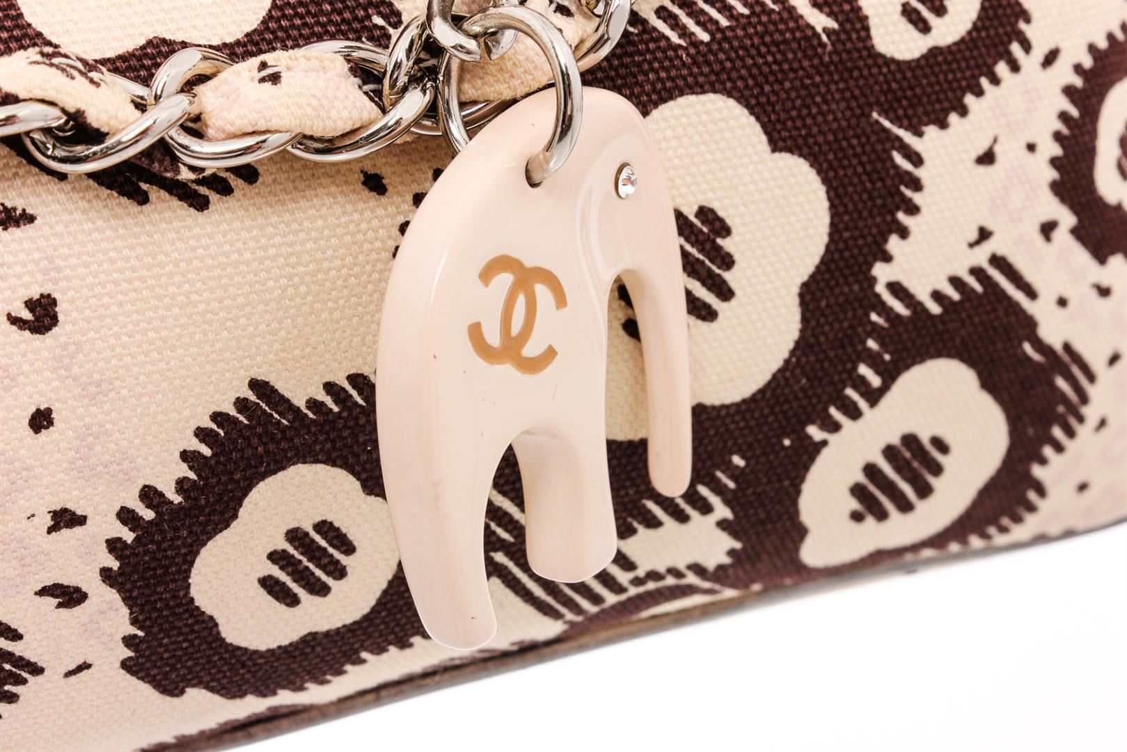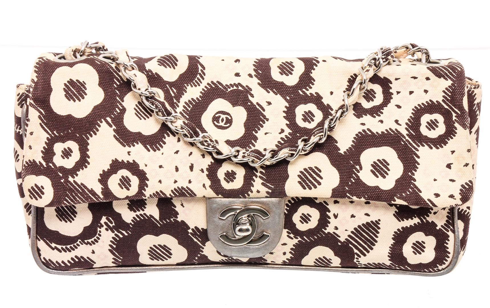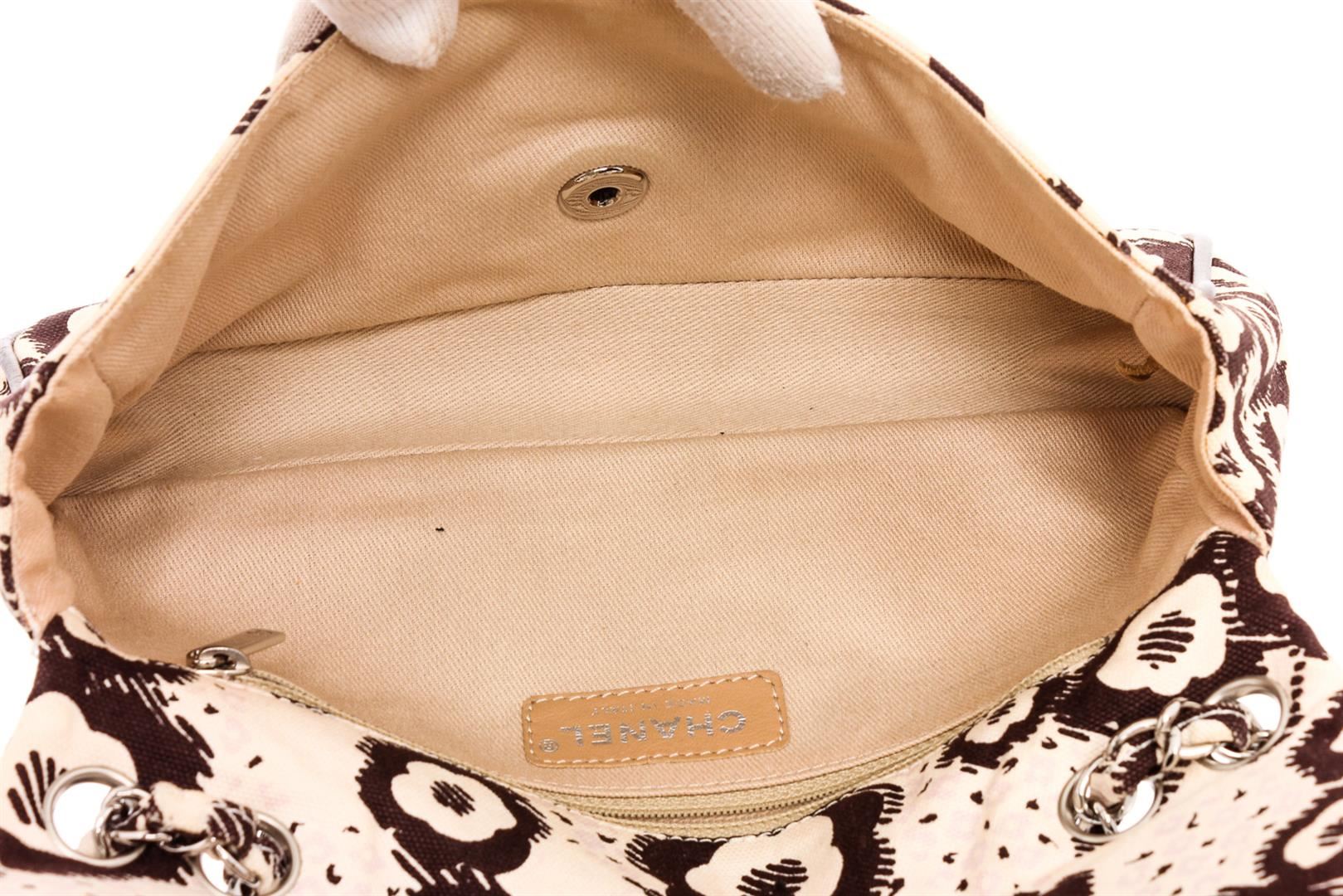 Crafted out of cream and brown Camelia fabric pattern, silver-tone hardware, and turn lock CC at front flap. Inner cream fabric lining.