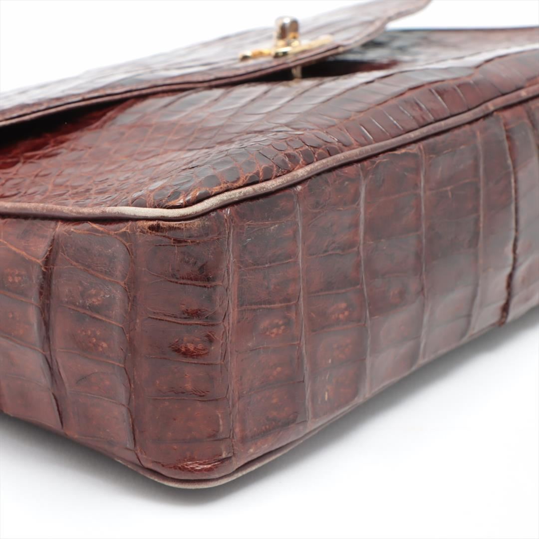One Chanel Brown Crocodile Leather CC Envelope Single Flap Shoulder Bag. Item is sold AS-IS. All available information is listed in the description and shown in the photo. Brown crocodile leather Chanel CC Envelope Single Flap bag with brown leather trim, gold-tone hardware, woven chain-link and leather shoulder strap, brown leather lining two interior zip pockets and front flap CC turn-lock closure. Shoulder Strap Drop 18?, Height 7?, Width 10.5?, Depth 3?
