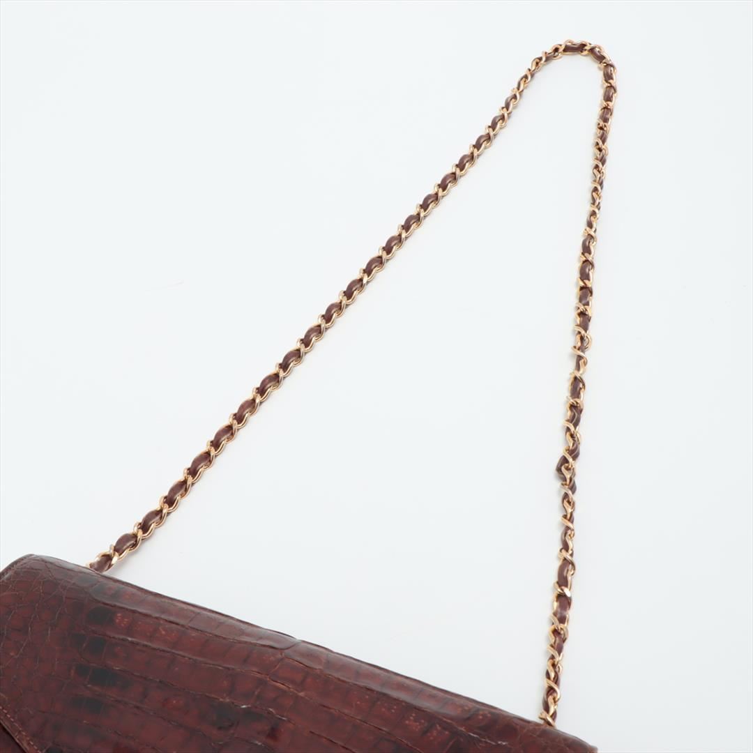 One Chanel Brown Crocodile Leather CC Envelope Single Flap Shoulder Bag. Item is sold AS-IS. All available information is listed in the description and shown in the photo. Brown crocodile leather Chanel CC Envelope Single Flap bag with brown leather trim, gold-tone hardware, woven chain-link and leather shoulder strap, brown leather lining two interior zip pockets and front flap CC turn-lock closure. Shoulder Strap Drop 18?, Height 7?, Width 10.5?, Depth 3?