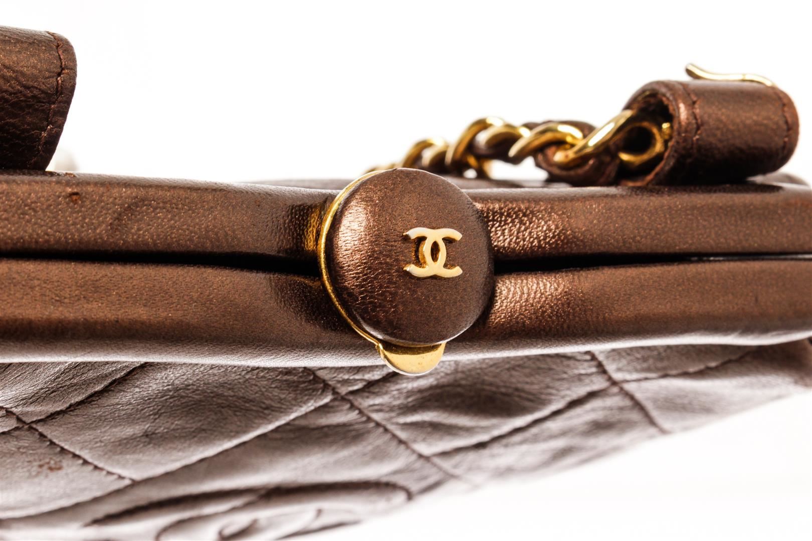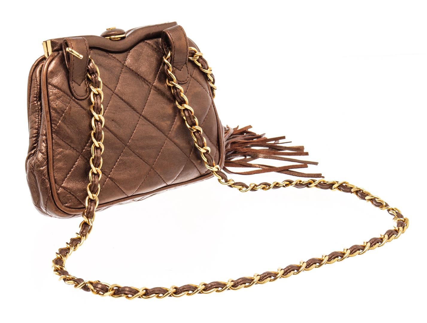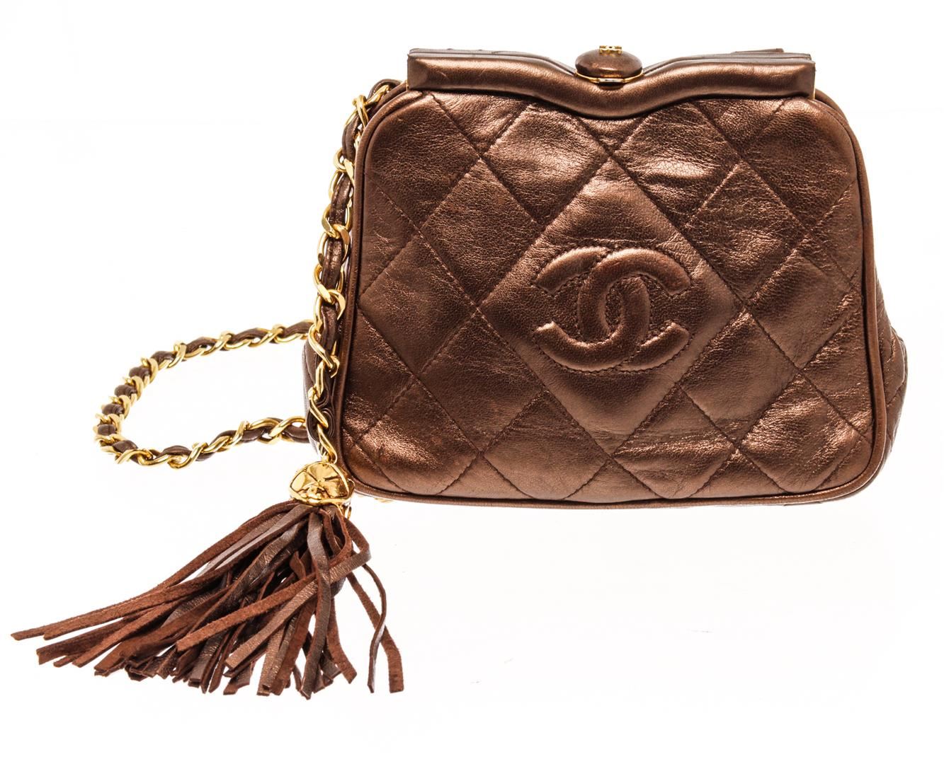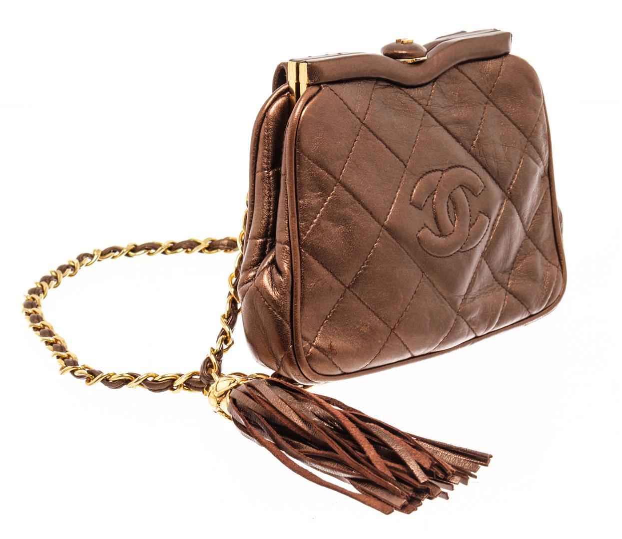 Chanel Brown Leather Mini Kisslock Shoulder Bag. All available information is listed in the description and shown in the photos. Chanel Brown Leather Mini Kisslock Shoulder Bag with gold-tone, lambskin, diamond quilting, signature interlocking cc logo, tassel detail, detachable adjustable leather and chain-link, waist strap, top clasp fastening, main compartment, internal zip-fastening pocket, internal logo stamp, gold-tone hardware. Depth 1.6 in, Height 4.7 in, Strap 35.4 in, Width 6.1 in / Depth 4 cm, Height 12 cm, Strap 90 cm, Width 15.5 cm