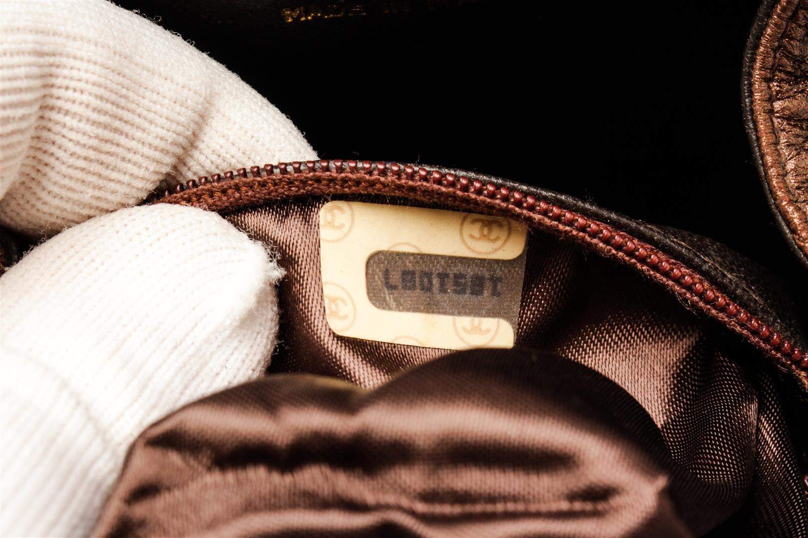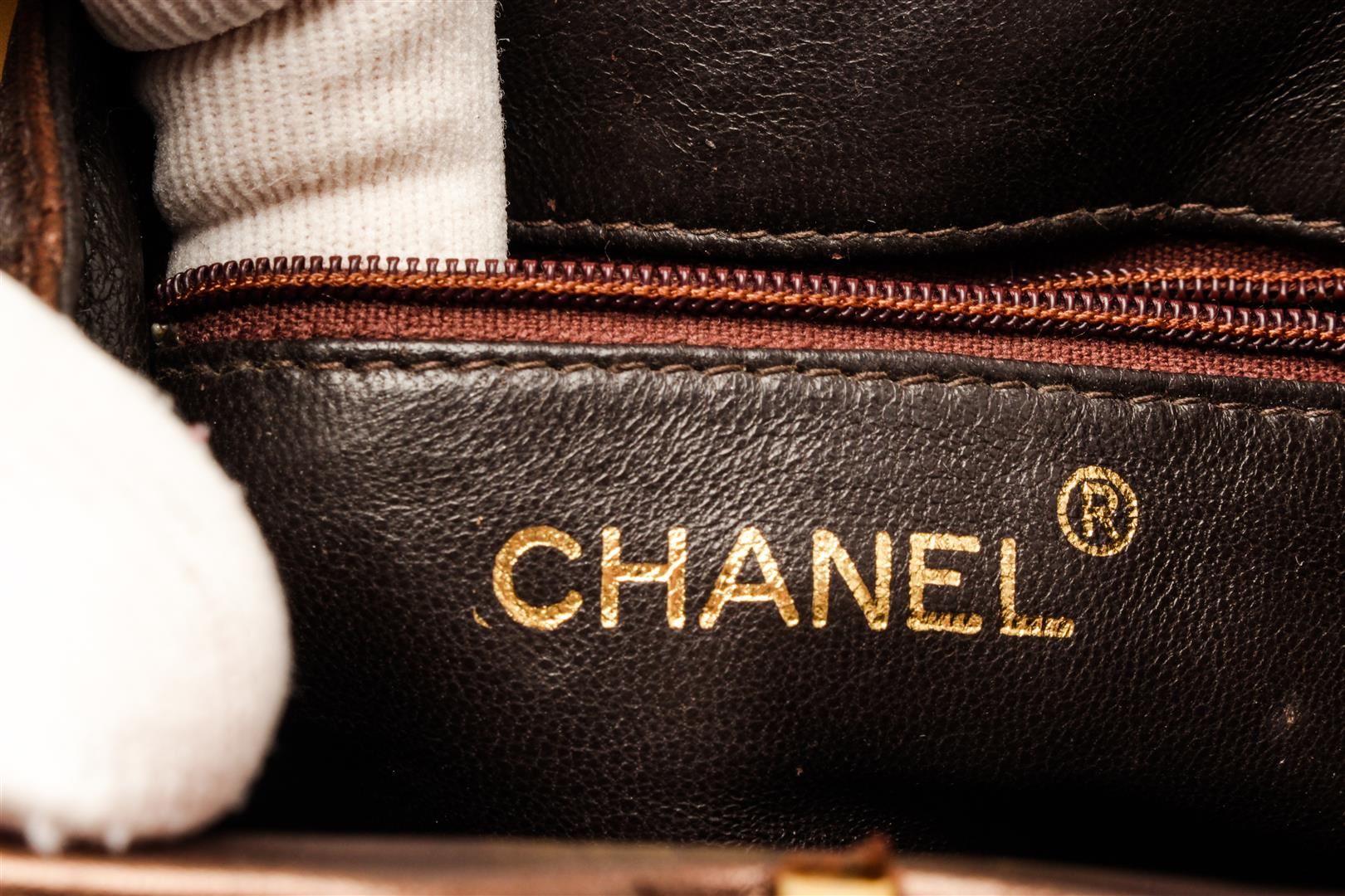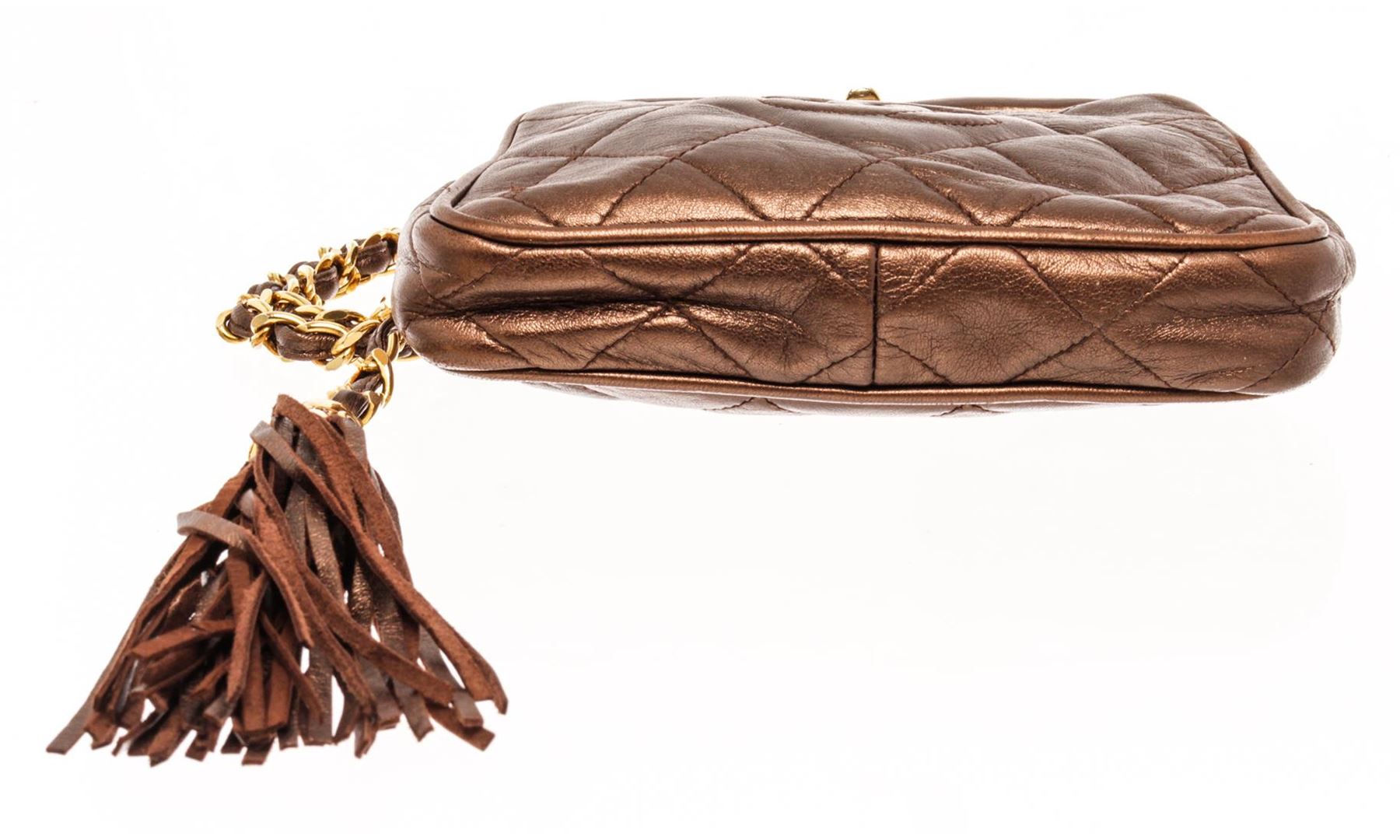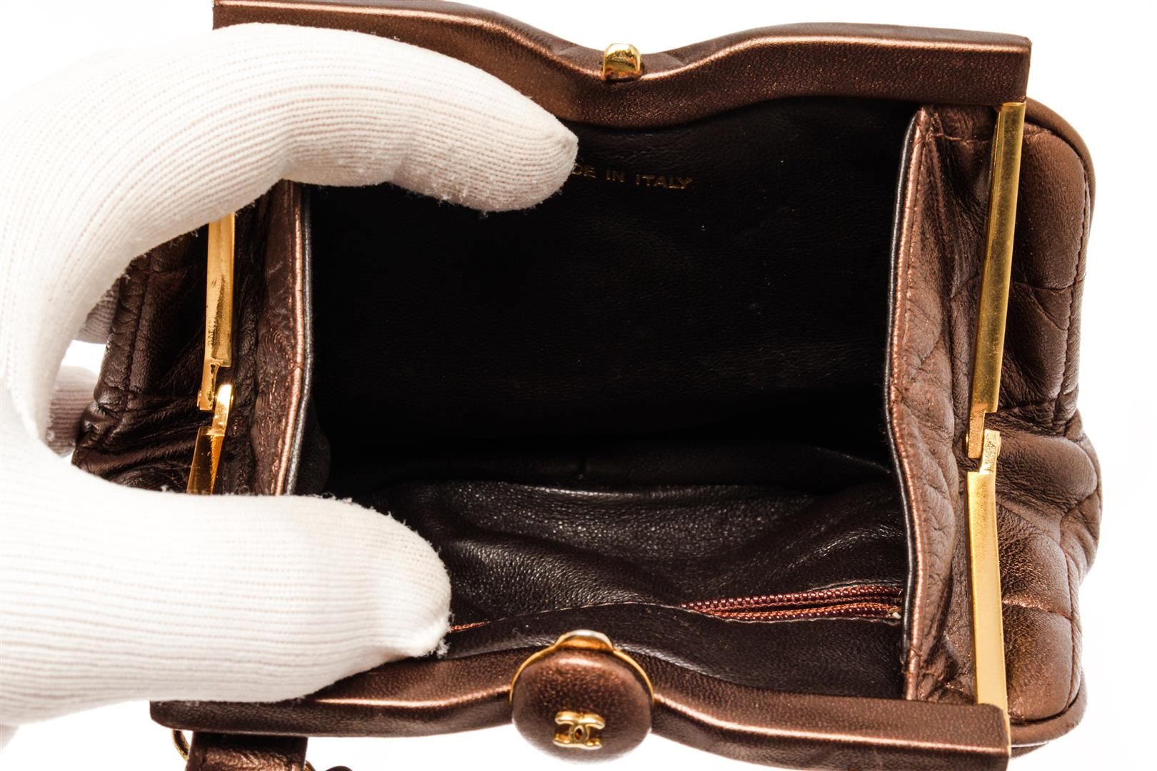 Chanel Brown Leather Mini Kisslock Shoulder Bag. All available information is listed in the description and shown in the photos. Chanel Brown Leather Mini Kisslock Shoulder Bag with gold-tone, lambskin, diamond quilting, signature interlocking cc logo, tassel detail, detachable adjustable leather and chain-link, waist strap, top clasp fastening, main compartment, internal zip-fastening pocket, internal logo stamp, gold-tone hardware. Depth 1.6 in, Height 4.7 in, Strap 35.4 in, Width 6.1 in / Depth 4 cm, Height 12 cm, Strap 90 cm, Width 15.5 cm