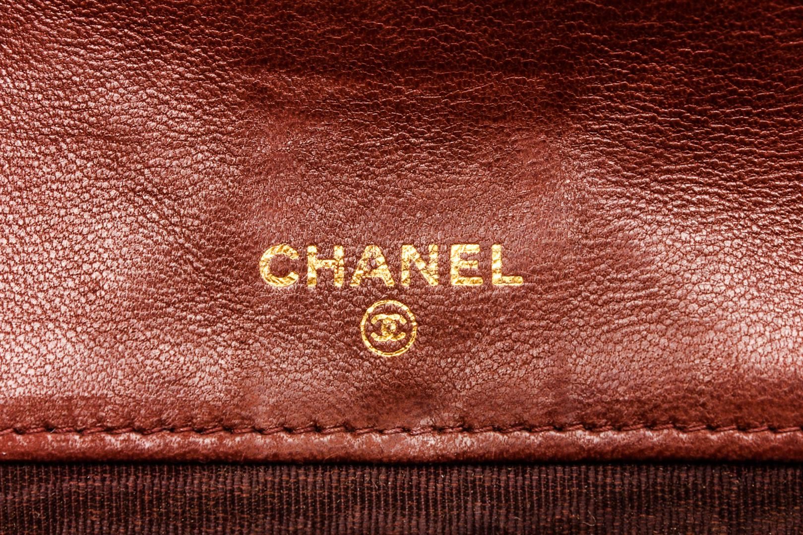 Chanel brown quilted caviar leather envelope flap wallet with gold-tone hardware, zip pocket on back, tonal canvas interior lining, three pockets; one with snap closure and overall snap closure at front with hardware logo.