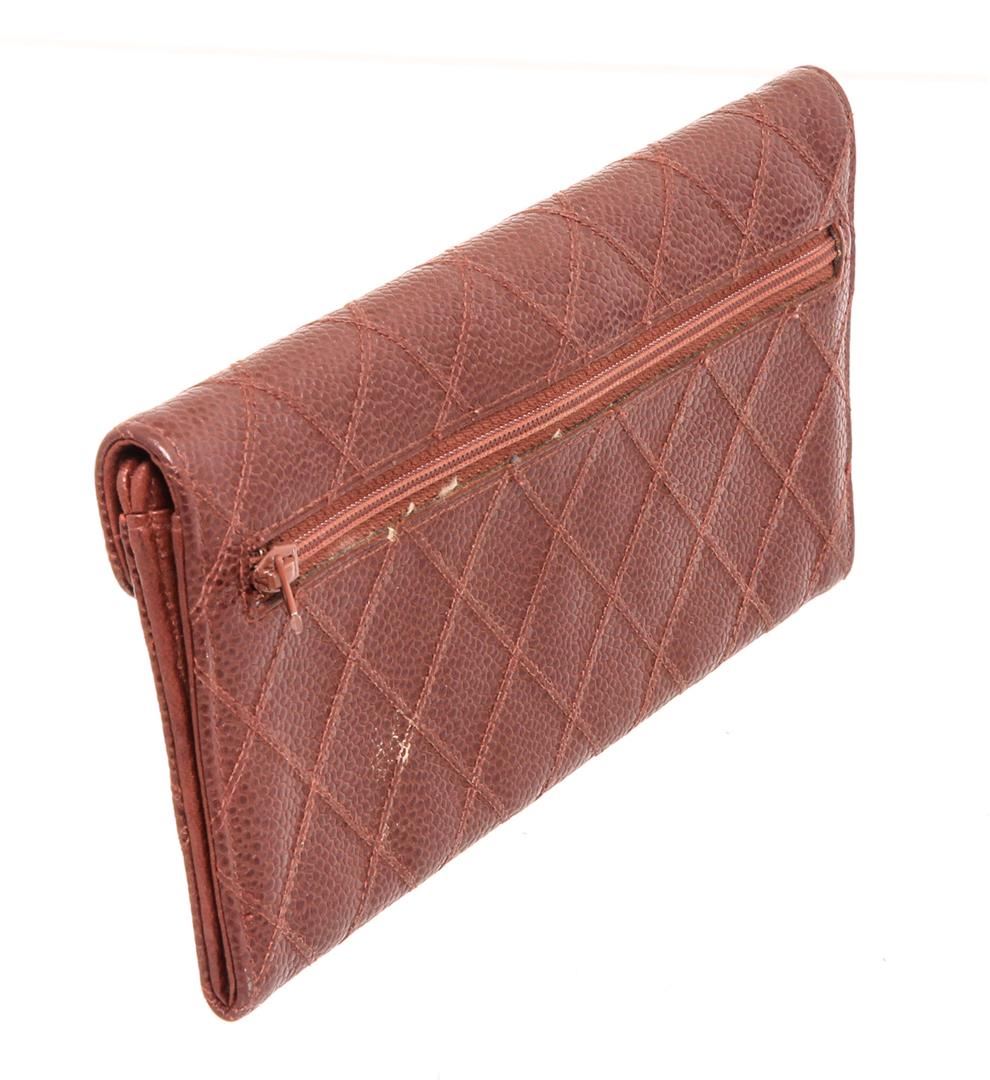 Chanel brown quilted caviar leather envelope flap wallet with gold-tone hardware, zip pocket on back, tonal canvas interior lining, three pockets; one with snap closure and overall snap closure at front with hardware logo.