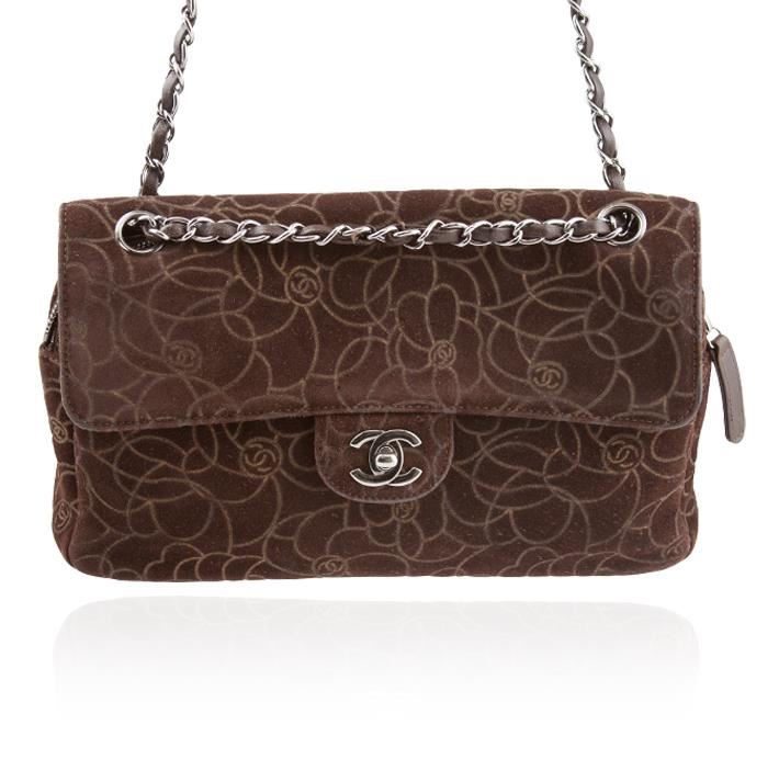 One Chanel maxi flap bag featuring: brown suede, flower print and measures 11.5" x 2.5" x 7". There is a small rip on the inside of the purse.