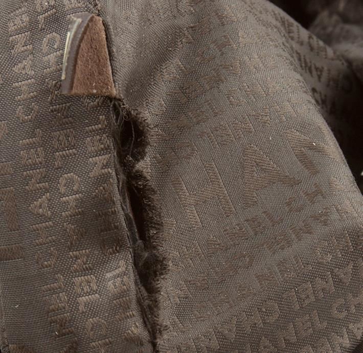 One Chanel maxi flap bag featuring: brown suede, flower print and measures 11.5" x 2.5" x 7". There is a small rip on the inside of the purse.