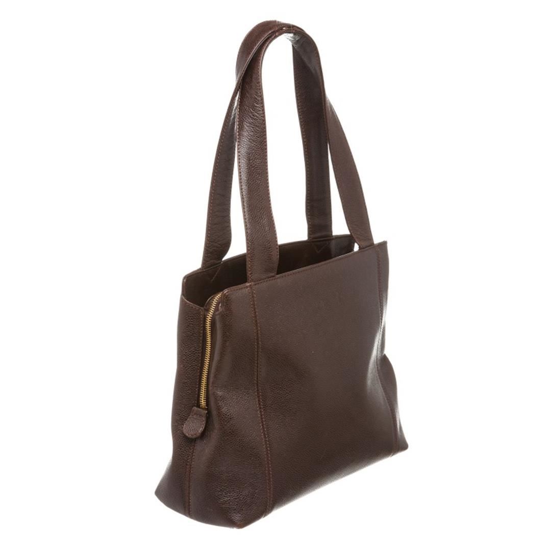 Overall zipper closure with two open side compartments. Interior is satin lined and contains oneip pocket and one side zipper pocket within the zipper closure compartment. Item is pre-owned.