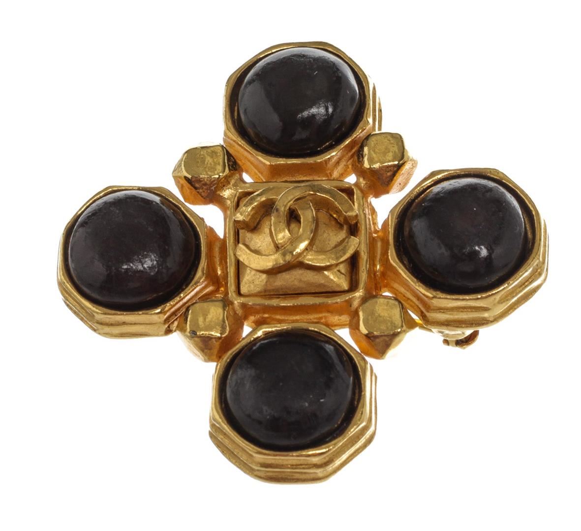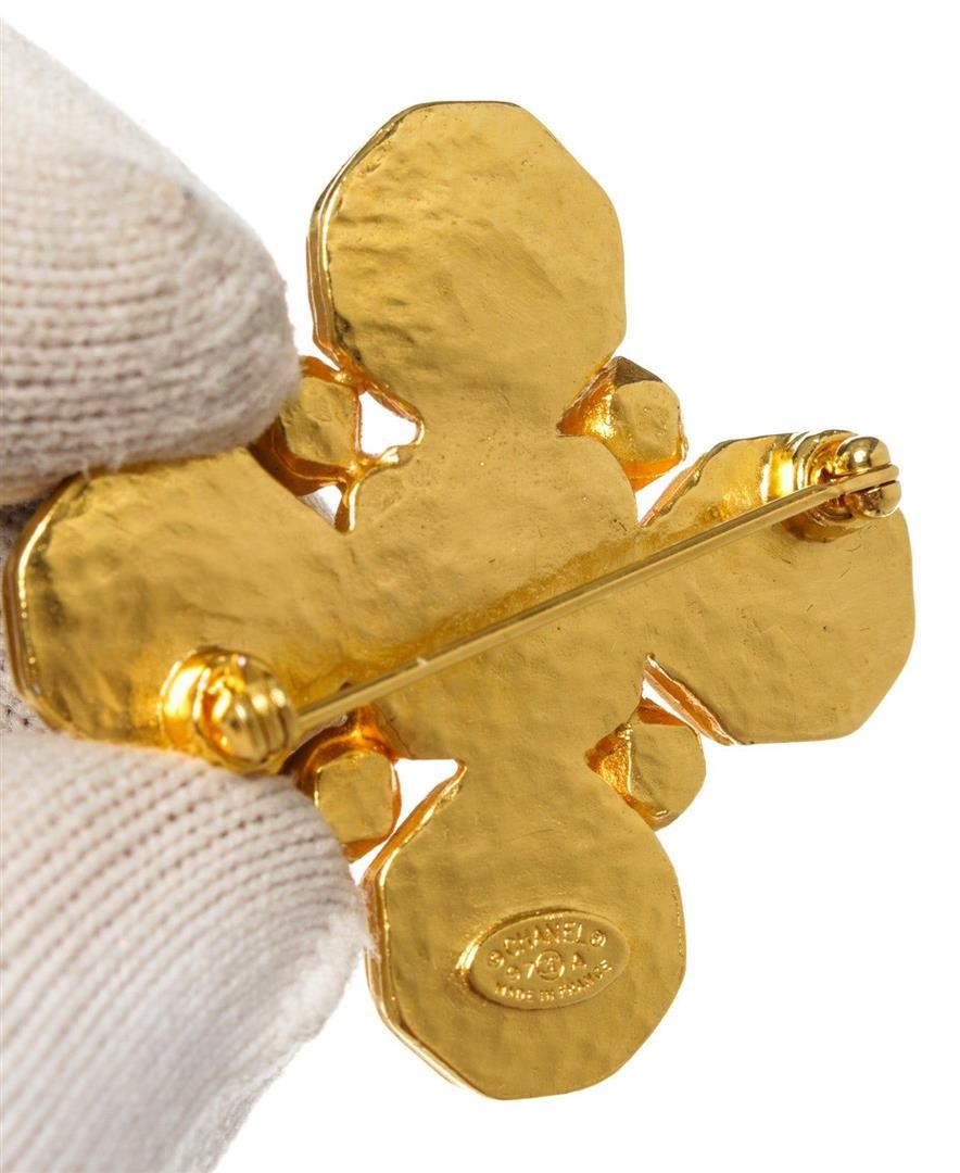Gold-tone cross shape Chanel CC brooch with CC logo at the center and gold-tone hardware.