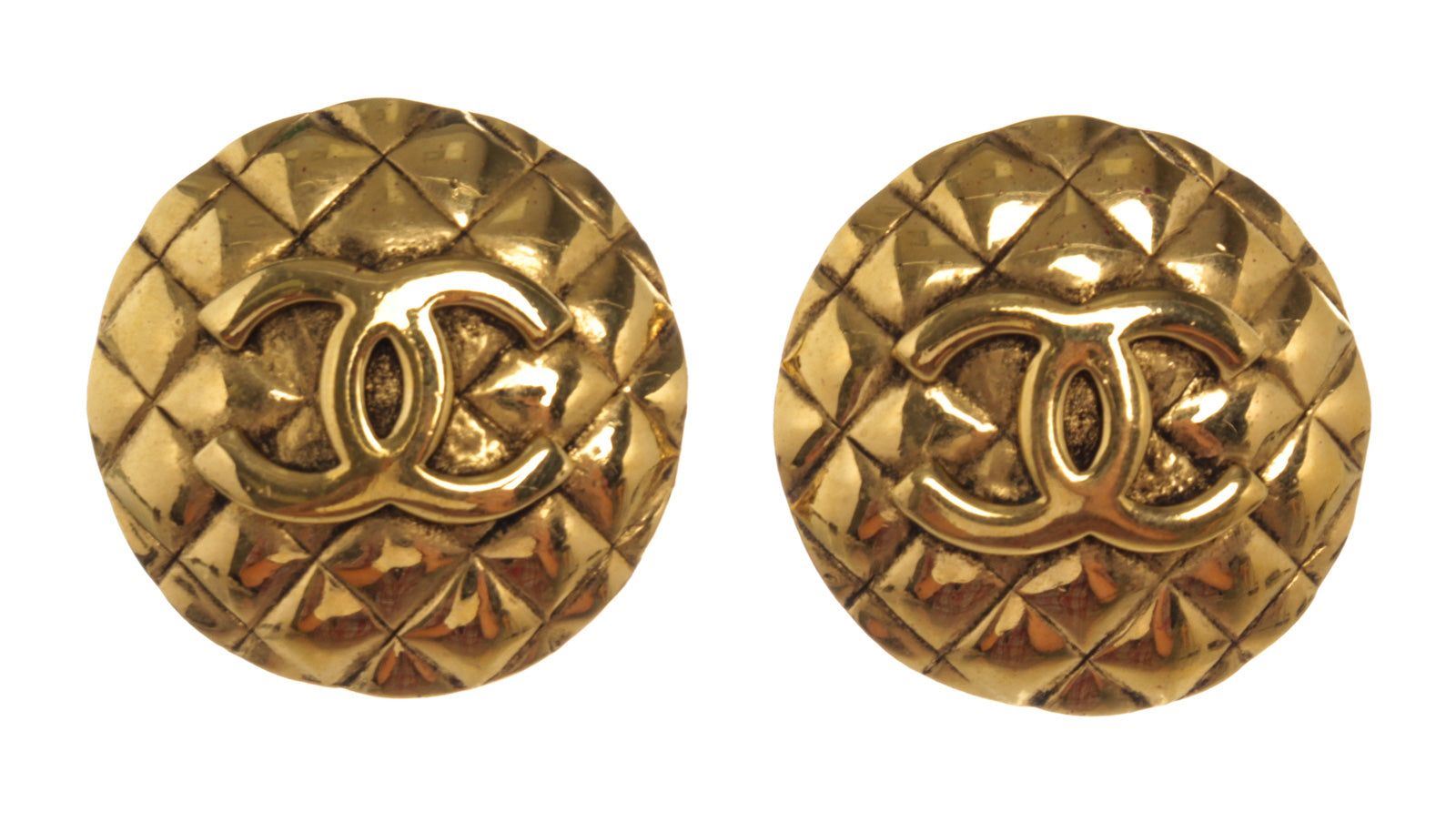 Gold-tone Chanel round earrings features CC logo, quilted pattern, clip-on closure, gold-tone hardware.