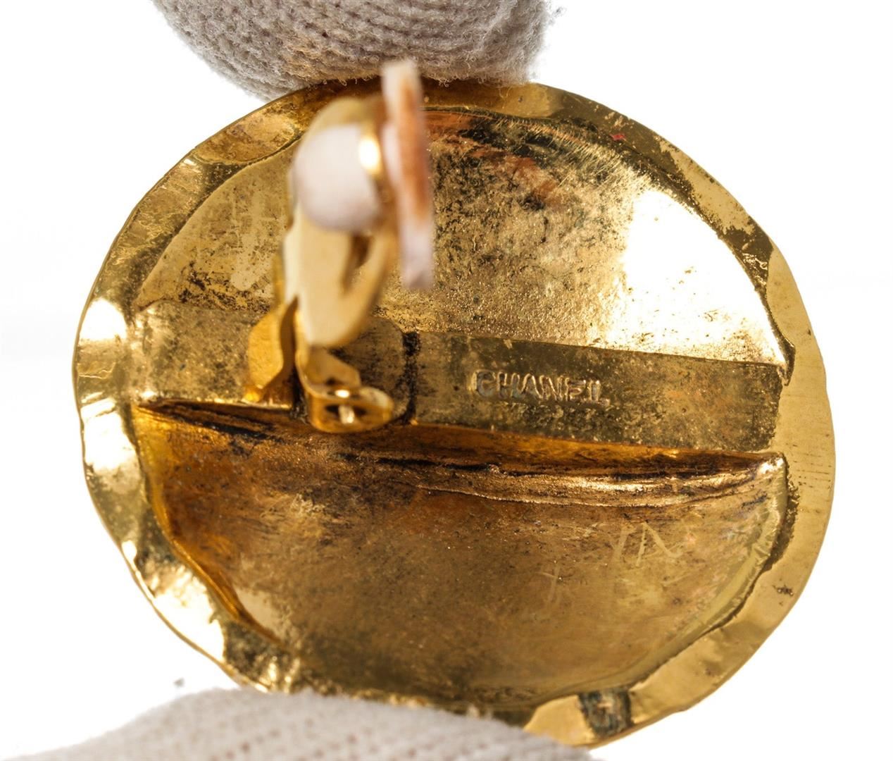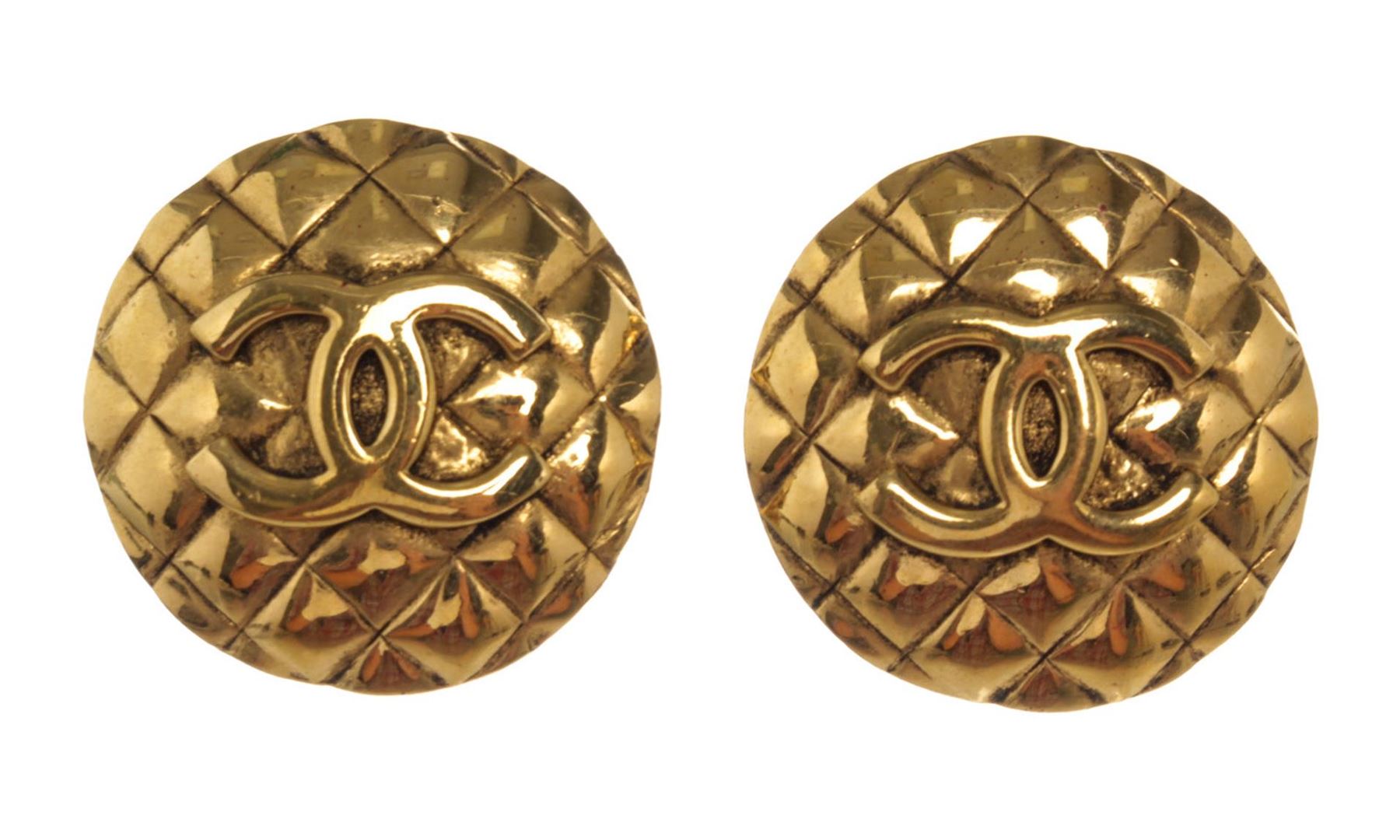 One Chanel CC Gold-tone Round Clip-On Earrings. Item is sold AS-IS. All available information is listed in the description and shown in the photo. Gold-tone Chanel round earrings features CC logo, quilted pattern, clip-on closure, gold-tone hardware.