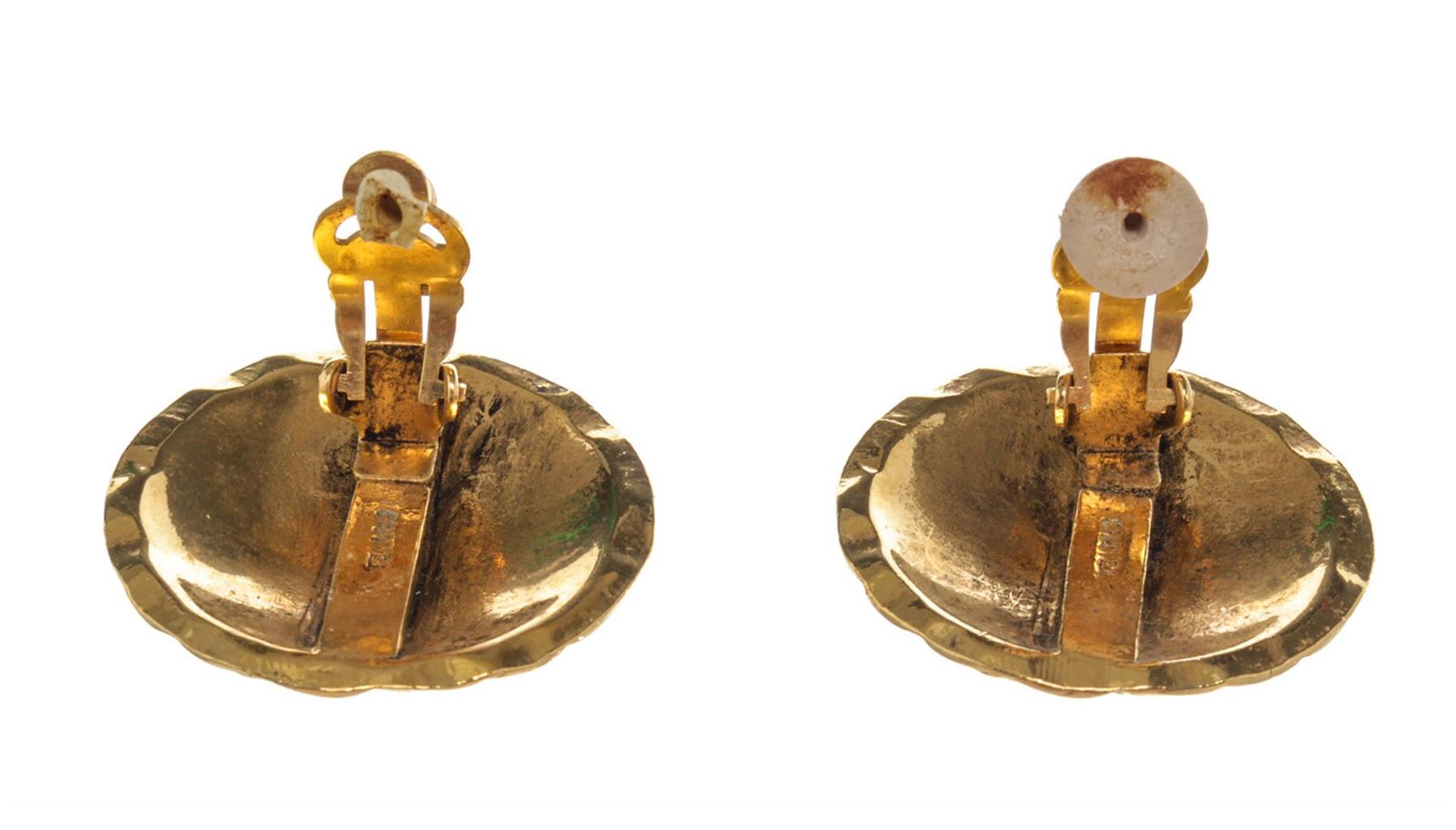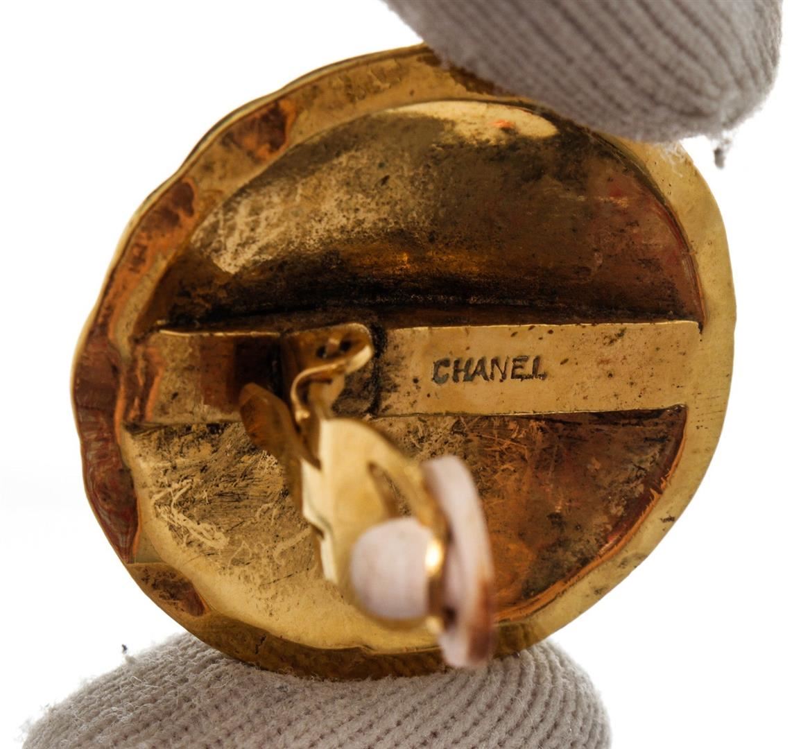 One Chanel CC Gold-tone Round Clip-On Earrings. Item is sold AS-IS. All available information is listed in the description and shown in the photo. Gold-tone Chanel round earrings features CC logo, quilted pattern, clip-on closure, gold-tone hardware.