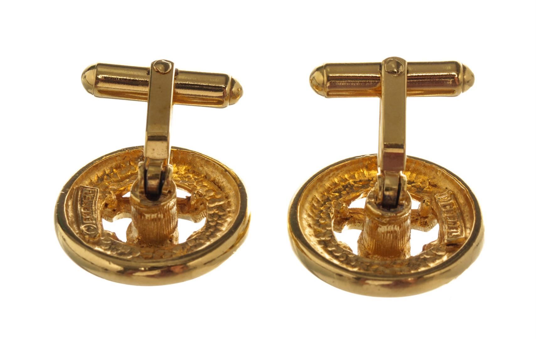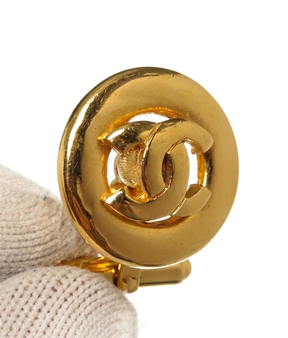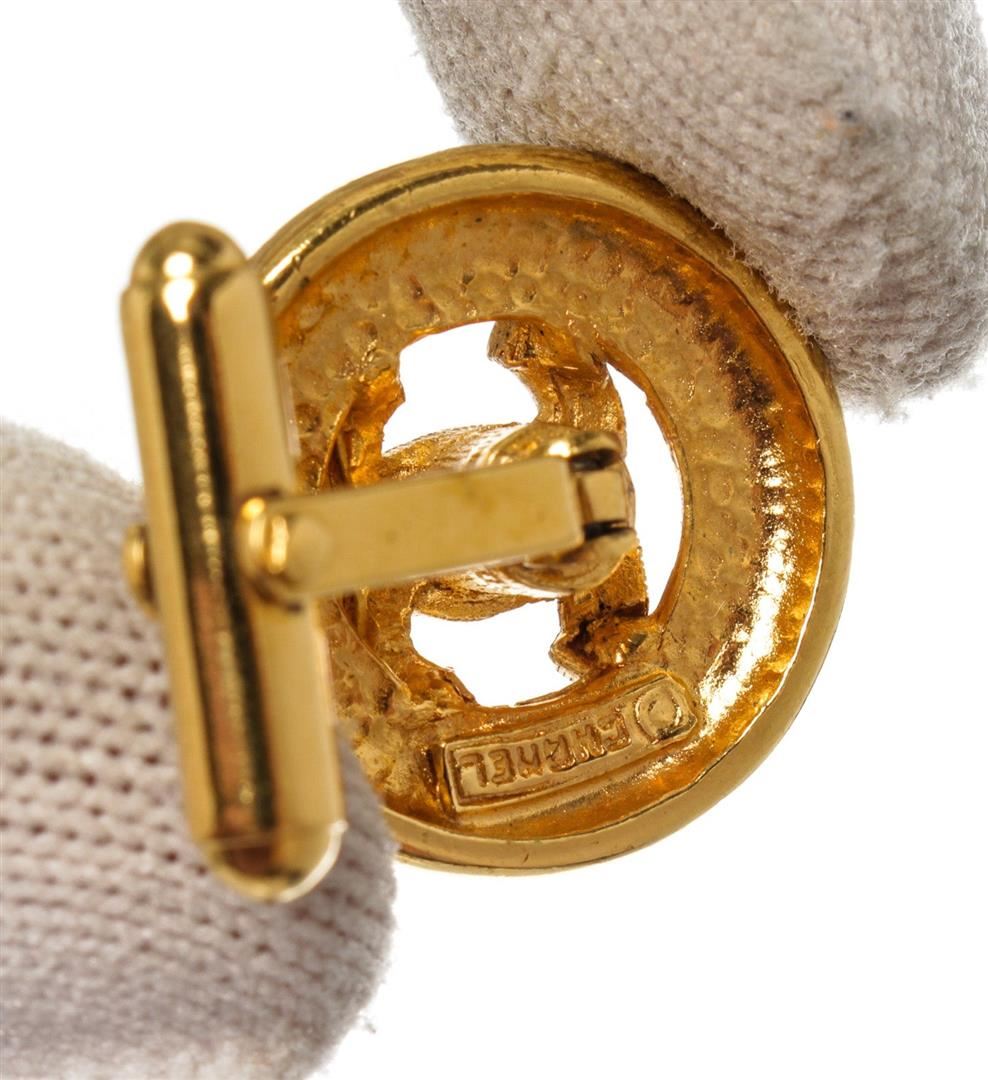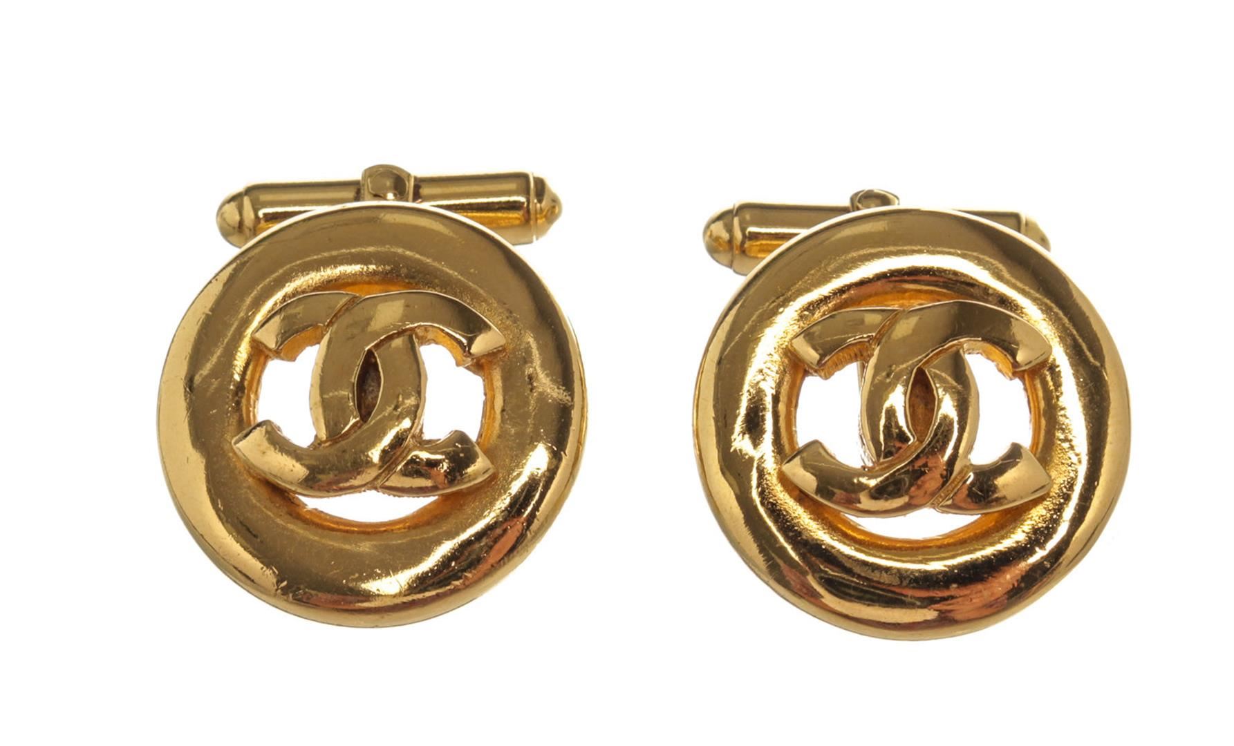 One Chanel CC Logo Gold-tone Cufflinks. Item is sold AS-IS. All available information is listed in the description and shown in the photo. Gold-tone and round Chanel CC cufflinks with iconic Chanel logo in the center and gold-tone hardware.