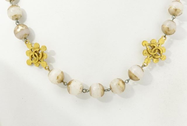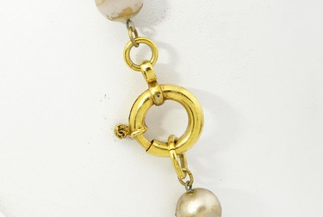 Chanel CC Necklace Gold and pearls. Brand: Chanel, Style: CC, Type: Necklace, Exterior Color: Gold and pearls, Closure: springring closure, Length: 1, Width: 1/2/2N/A23, Height: 17 1/2. Condition: wear on pearls and general wear. Item is sold AS-IS and all information pertaining to this lot is available in the photos or this description.