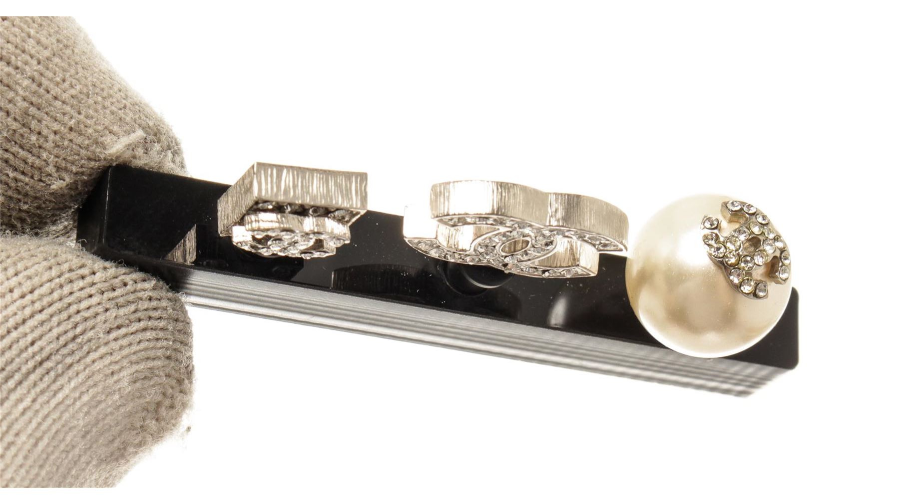 One Chanel CC Pearl Aux Plug Set of 3. Item is sold AS-IS. All available information is listed in the description and shown in the photo. Chanel CC pearl AUX plug is a set of three AUX plugs, one faux pearl with a rhinestone CC logo on it, one rhinestone CC logo, and one square with a CC logo and rhinestones.