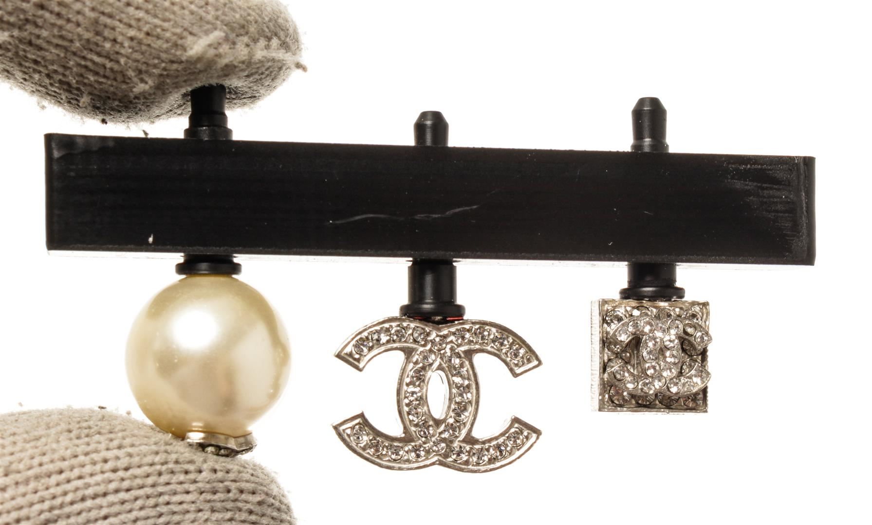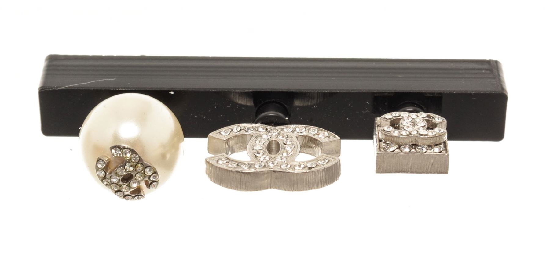 One Chanel CC Pearl Aux Plug Set of 3. Item is sold AS-IS. All available information is listed in the description and shown in the photo. Chanel CC pearl AUX plug is a set of three AUX plugs, one faux pearl with a rhinestone CC logo on it, one rhinestone CC logo, and one square with a CC logo and rhinestones.