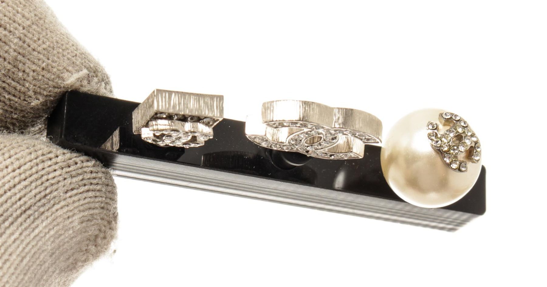 One Chanel CC Pearl Aux Plug Set of 3. Item is sold AS-IS. All available information is listed in the description and shown in the photo. Chanel CC pearl AUX plug is a set of three AUX plugs, one faux pearl with a rhinestone CC logo on it, one rhinestone CC logo, and one square with a CC logo and rhinestones.