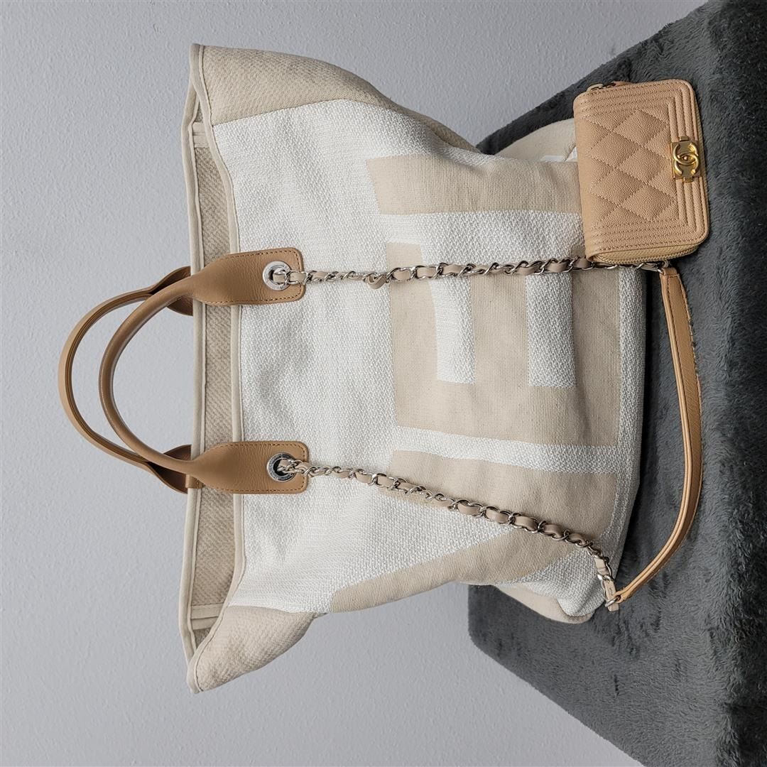 One Chanel CC SHW Canvas Tote Bag in Canvas Cream. Size: W: 38cm H: 38cm x D: 14.5cm (W: 15.0" x H: 15.0" x D: 5.7") Handle: 27cm (10.6") Shoulder: 82 (32.3")