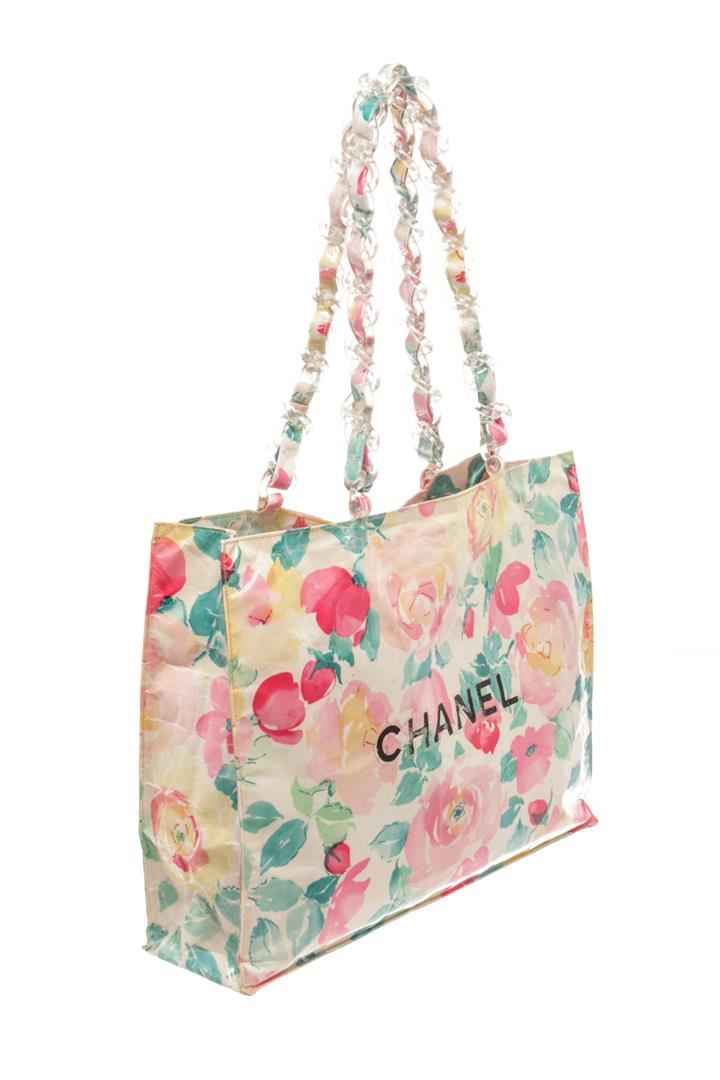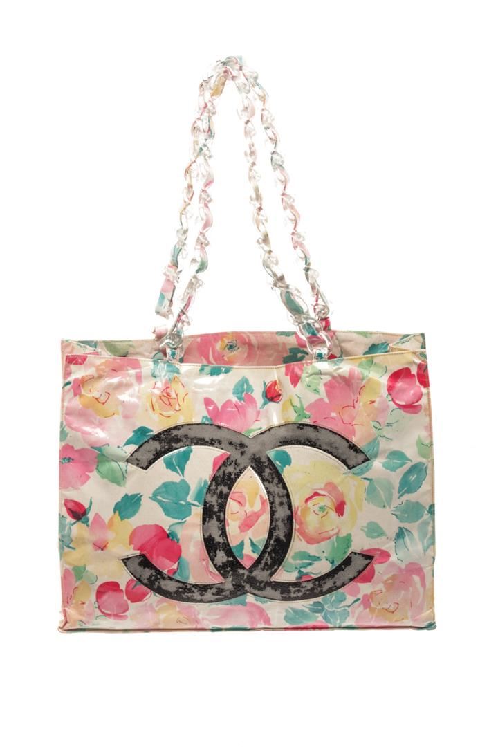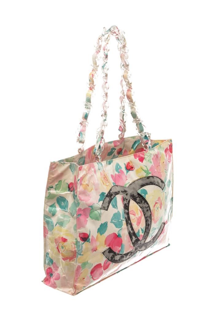 Chanel CC Yellow Vinyl Floral Tote Bag. All available information is listed in the description and shown in the photos. Chanel White Floral Multicolor Vinyl CC Floral Tote Bag. Features a clear plastic and floral handle as the hardware, white leather interior, and a gold zipper closure. Height: 11.5", Width: 16", Depth: 3.5" / 29.21 x 40.64 x 8.89 CM