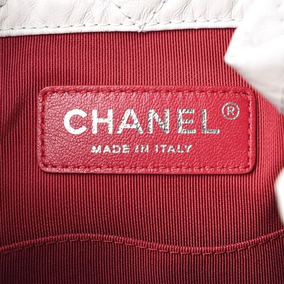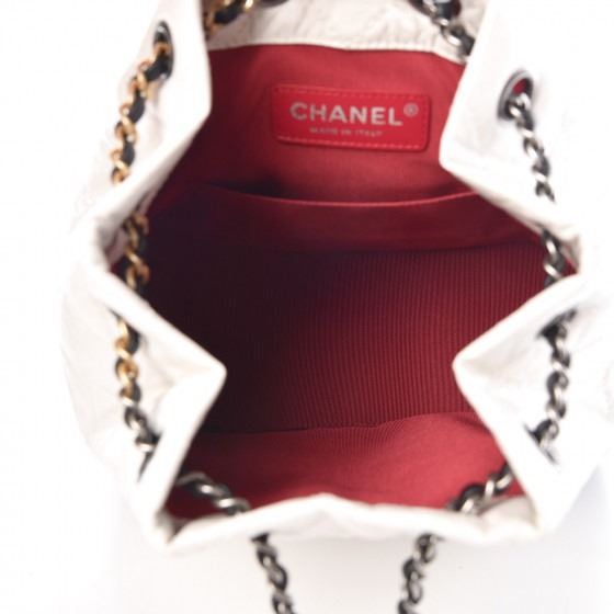 This backpack is crafted of diamond-stitched textured aged smooth white calfskin leather. The shoulder bag features a smooth black leather base, a ruthenium CC logo, ruthenium, aged, polished gold and silver chain threaded leather shoulder straps and an open top. This opens to a spacious deep red fabric interior with a patch pocket.