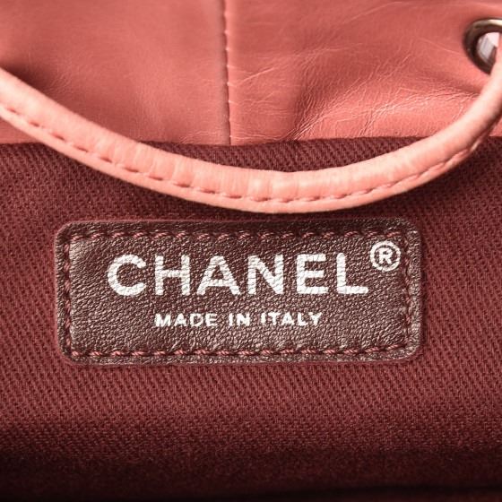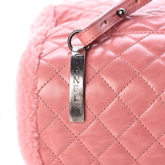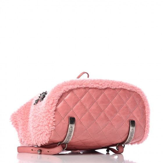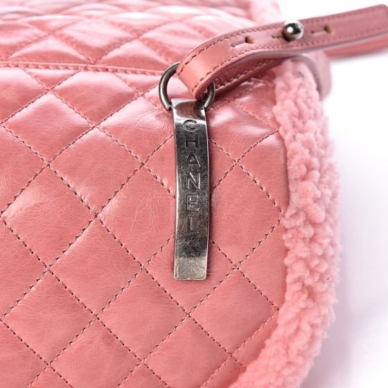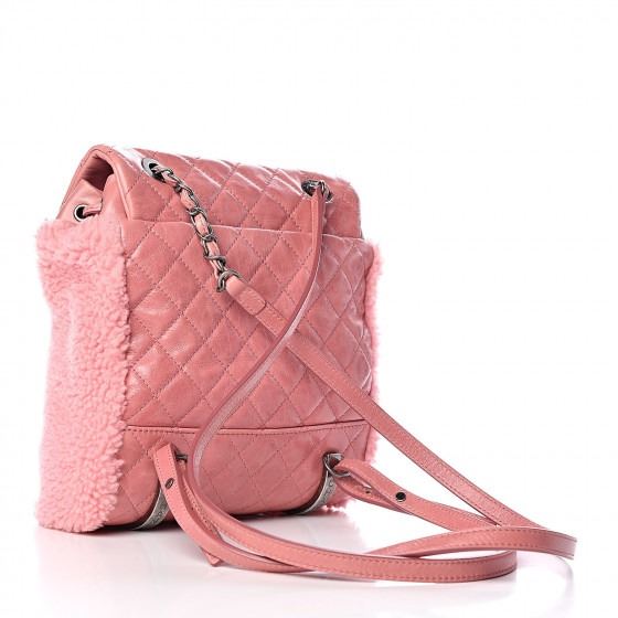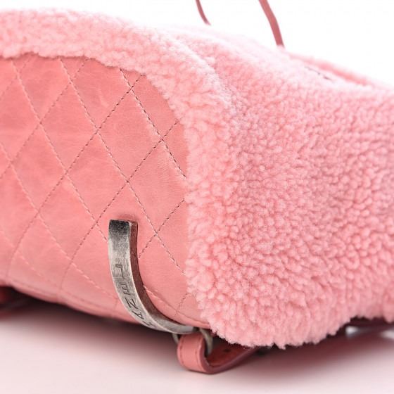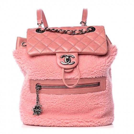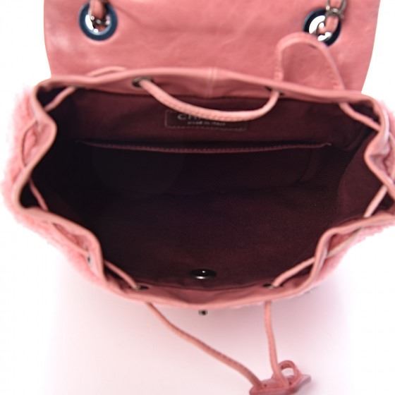 Pink stylish backpack is beautifully crafted of soft and smooth diamond-quilted glazed calfskin leather in pink, with the front exterior adorned in shearling. It features a ruthenium chain link leather threaded shoulder straps, a facing external zipper pocket that opens with a silver-plated Chanel CC dangling zipper pull, and a crossover top flap that closes with a cinch cord. This opens to a spacious burgundy fabric interior with a patch pocket.