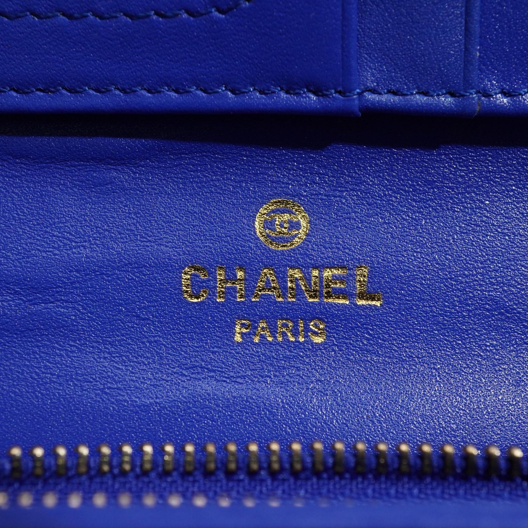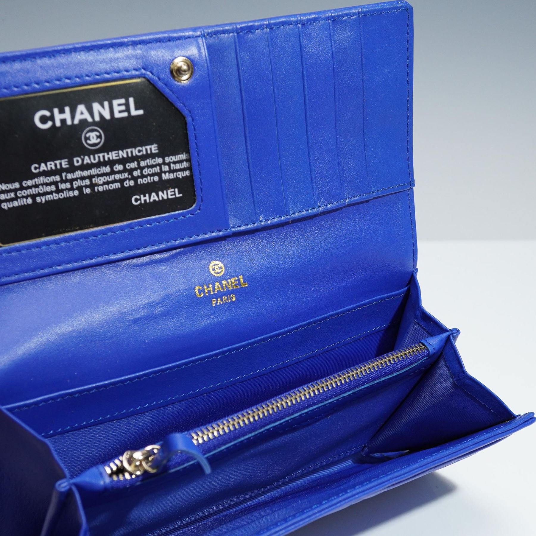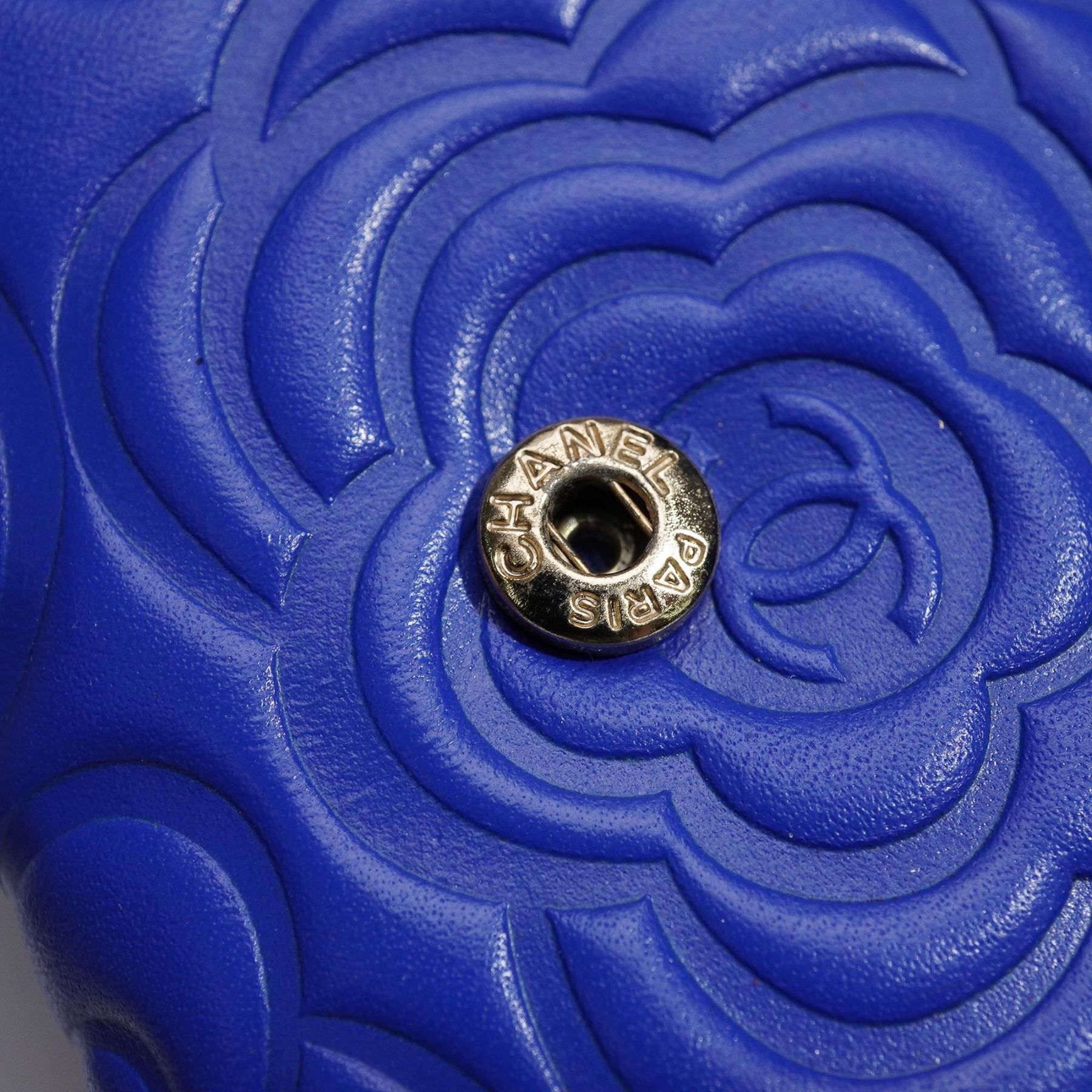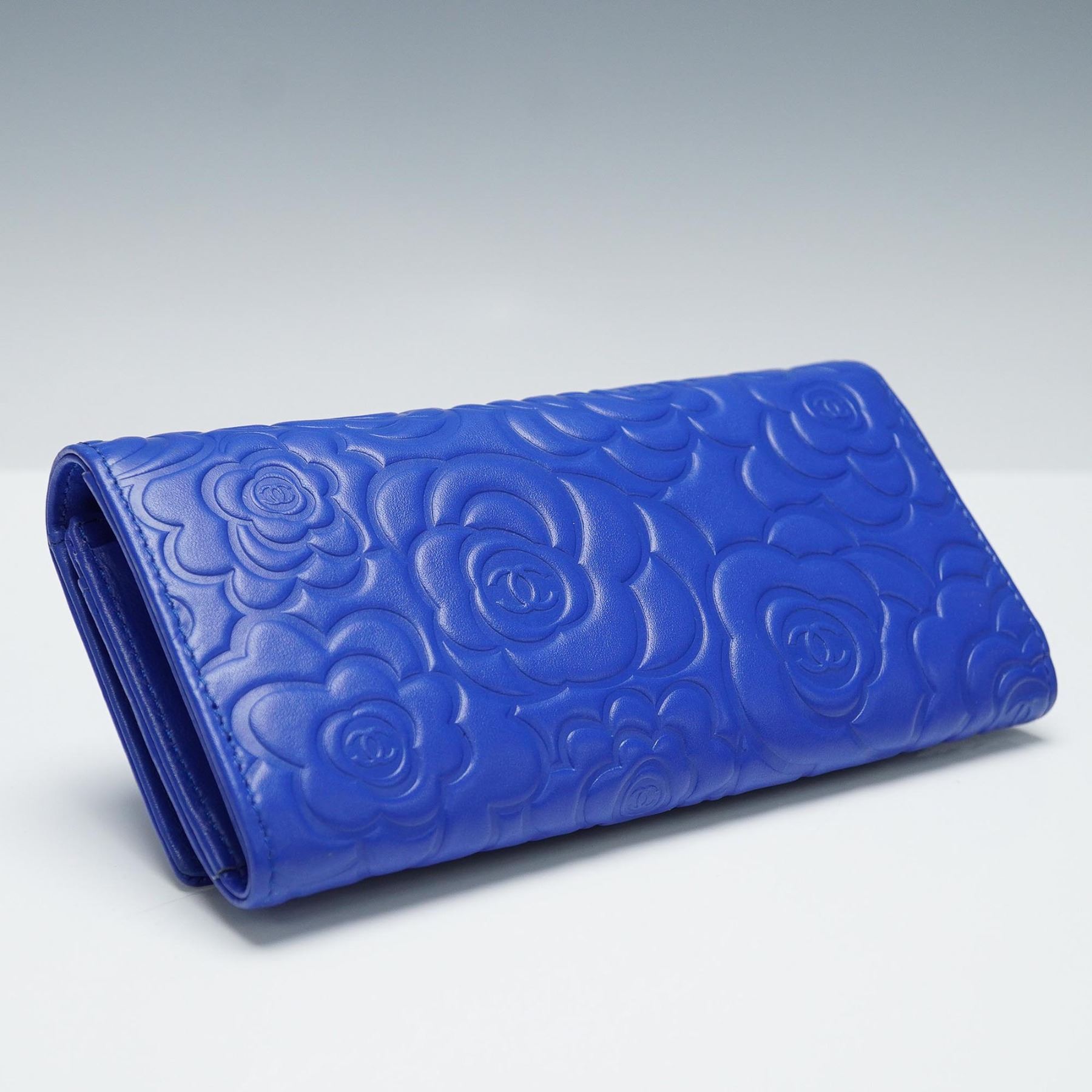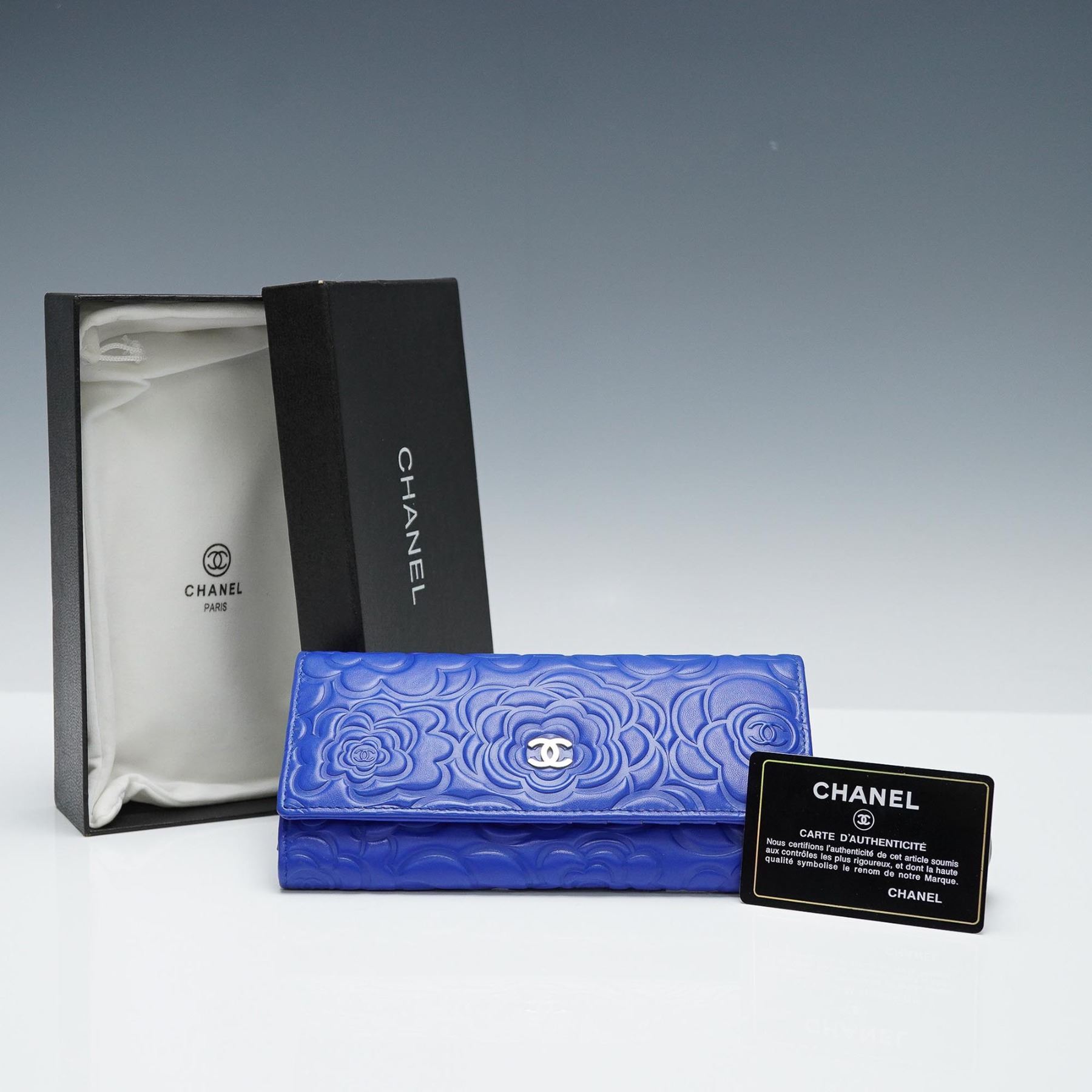 Chanel Camellia embossed long wallet in vibrant blue lambskin leather, showcasing the iconic CC logo in silver-tone hardware at the center. The floral motif is deeply embossed throughout, and the interior features multiple card slots, bill compartments, and a zippered coin pocket. Includes original Chanel authenticity card with serial number 10218184, black Chanel box, and white protective pouch. Stamped CHANEL PARIS in gold lettering inside with a matching snap closure.