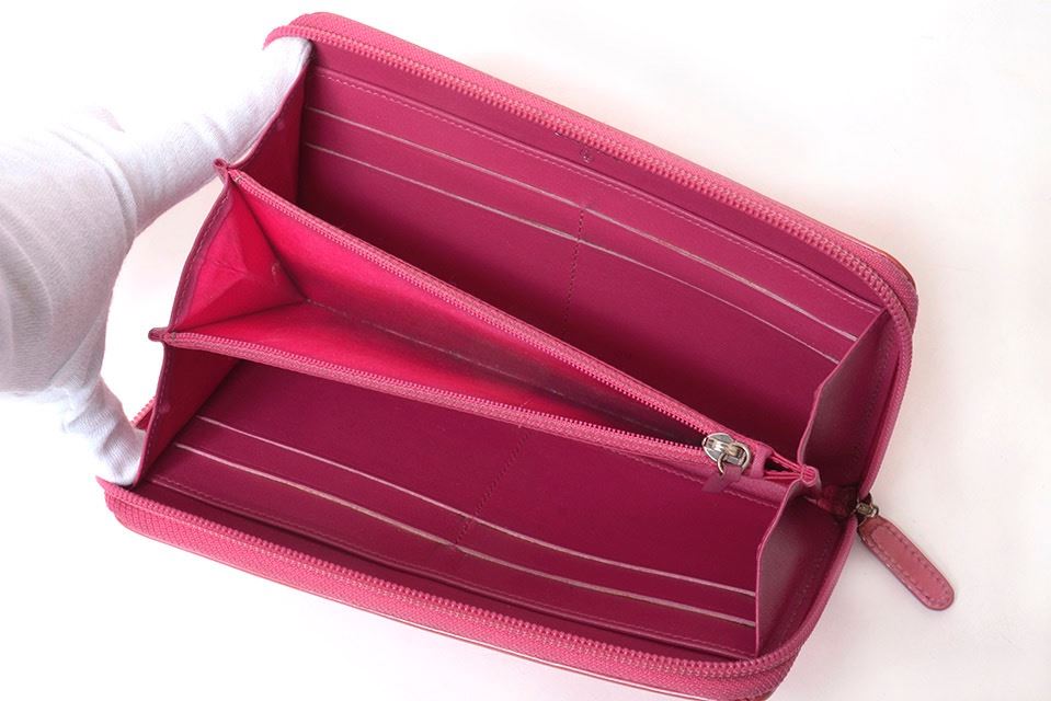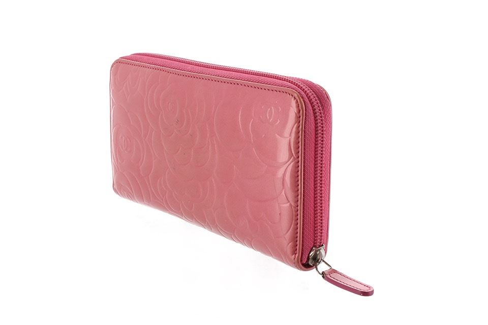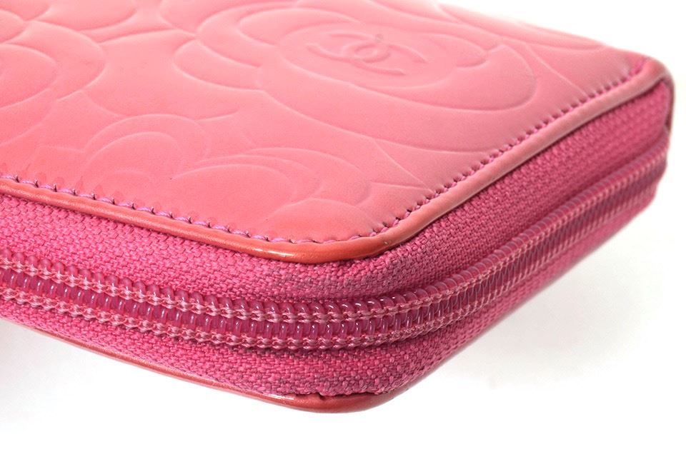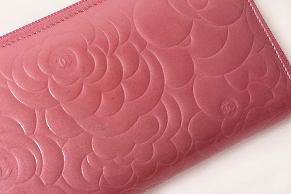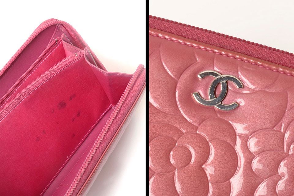 This wallet features a patent leather body, zip around closure, and interior zip and slip pockets. Leather x Patent Leather Pink Exterior is slightly stained. Size: 10.5 x 19.5 x 2.5 Card: YES Made in: France