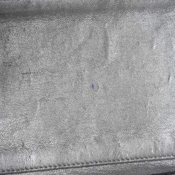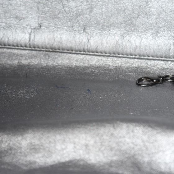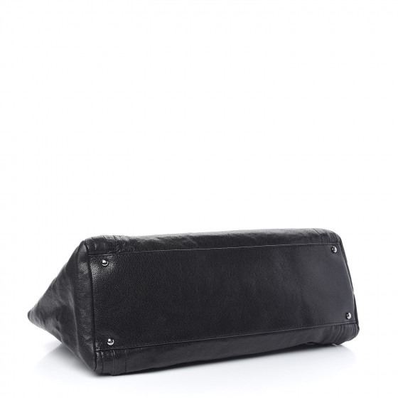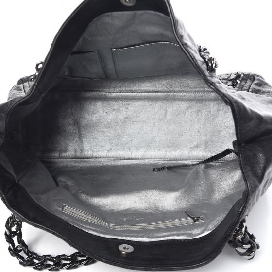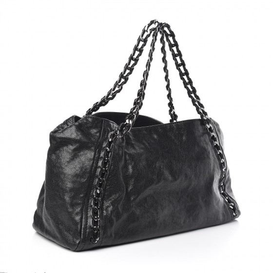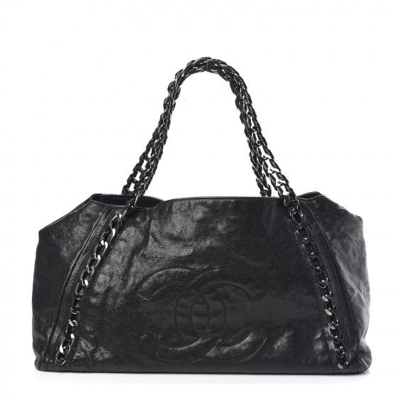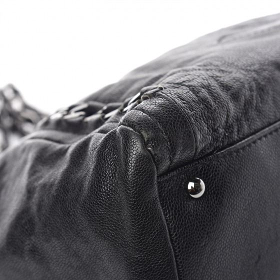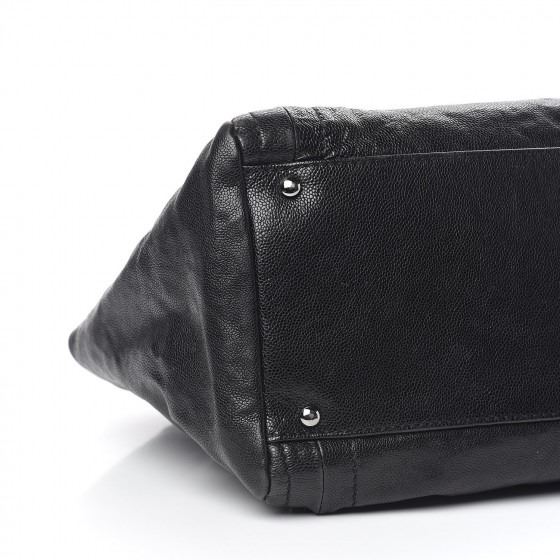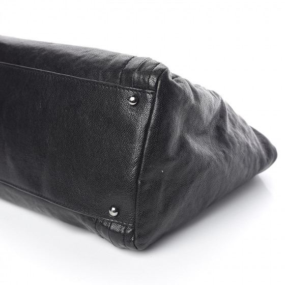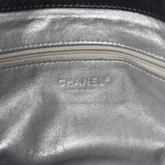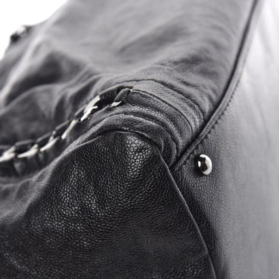 Black tote is beautifully crafted of luxurious glazed caviar leather. The bag features thick dark silver chain link leather threaded straps which are incorporated into the sides of the bag, and a large quilted Chanel CC logo on the front. The top unsnaps to a silver leather interior with zipper and patch pockets.